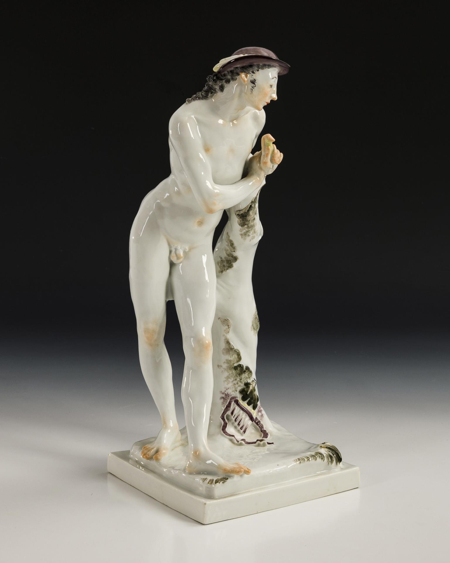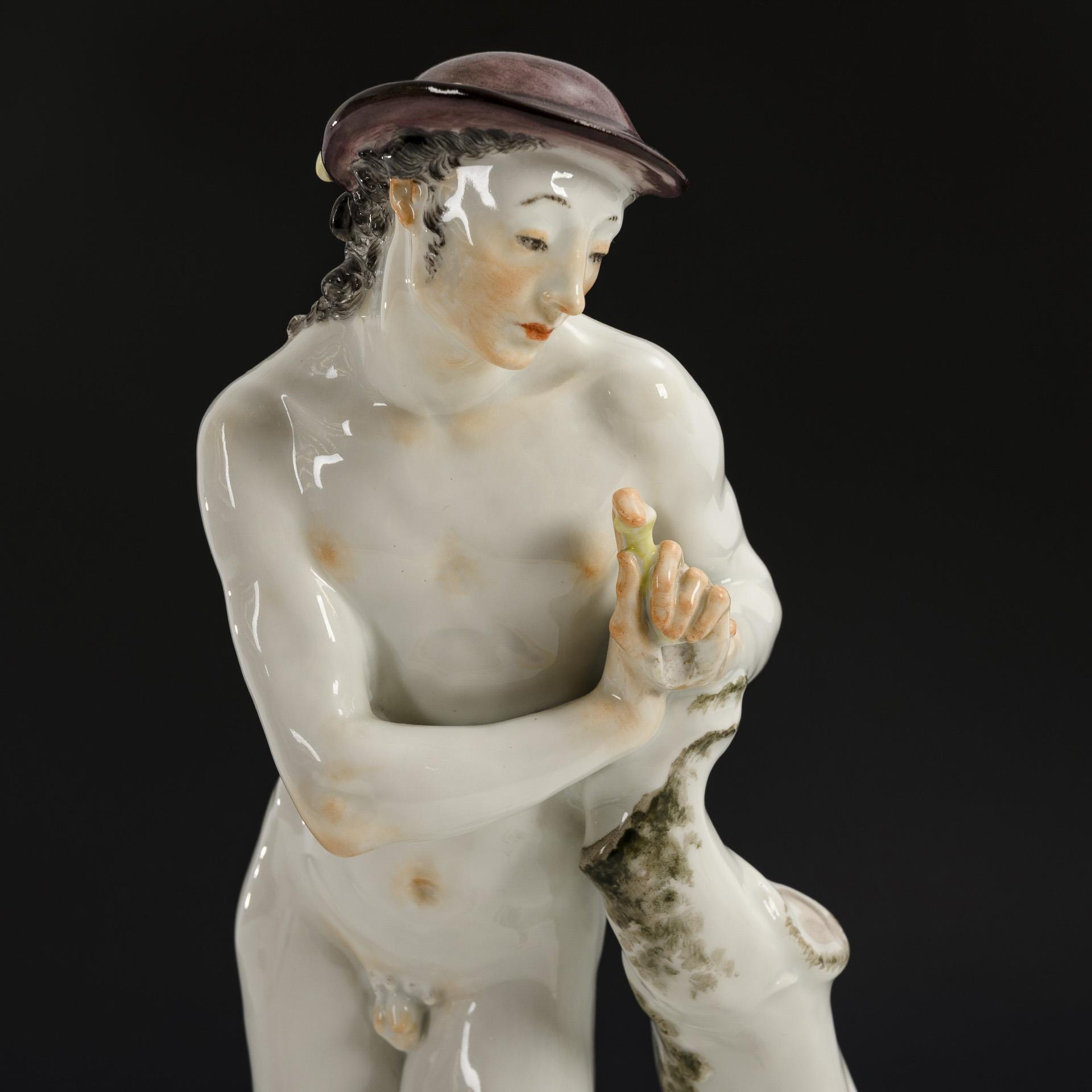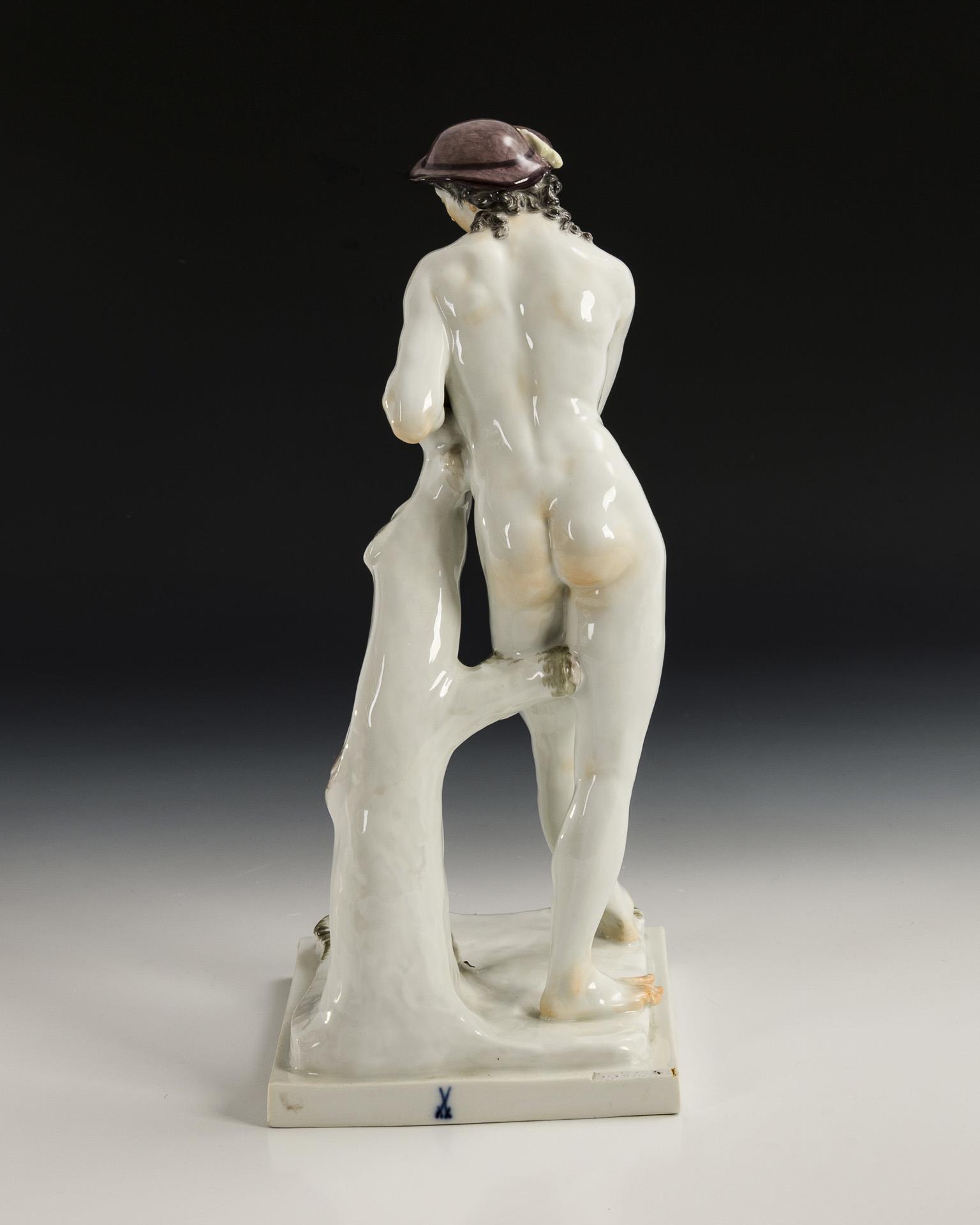 Nude depiction of a shepherd leaning against a tree trunk. Shepherd's crook missing.