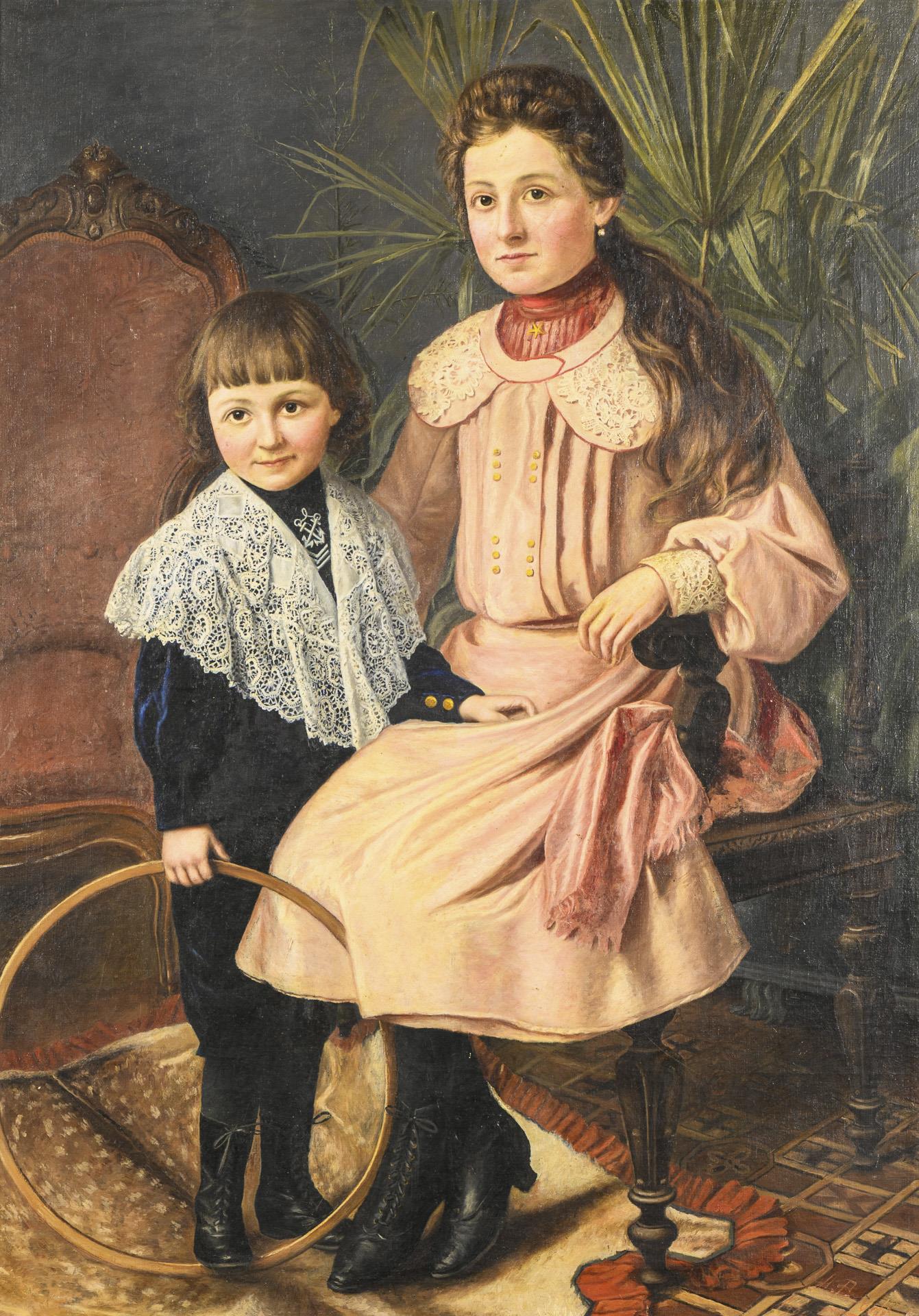 Portrait of the girl sitting in the armchair with her younger brother in a dark blue suit and with a hoop next to her. Traces of age.