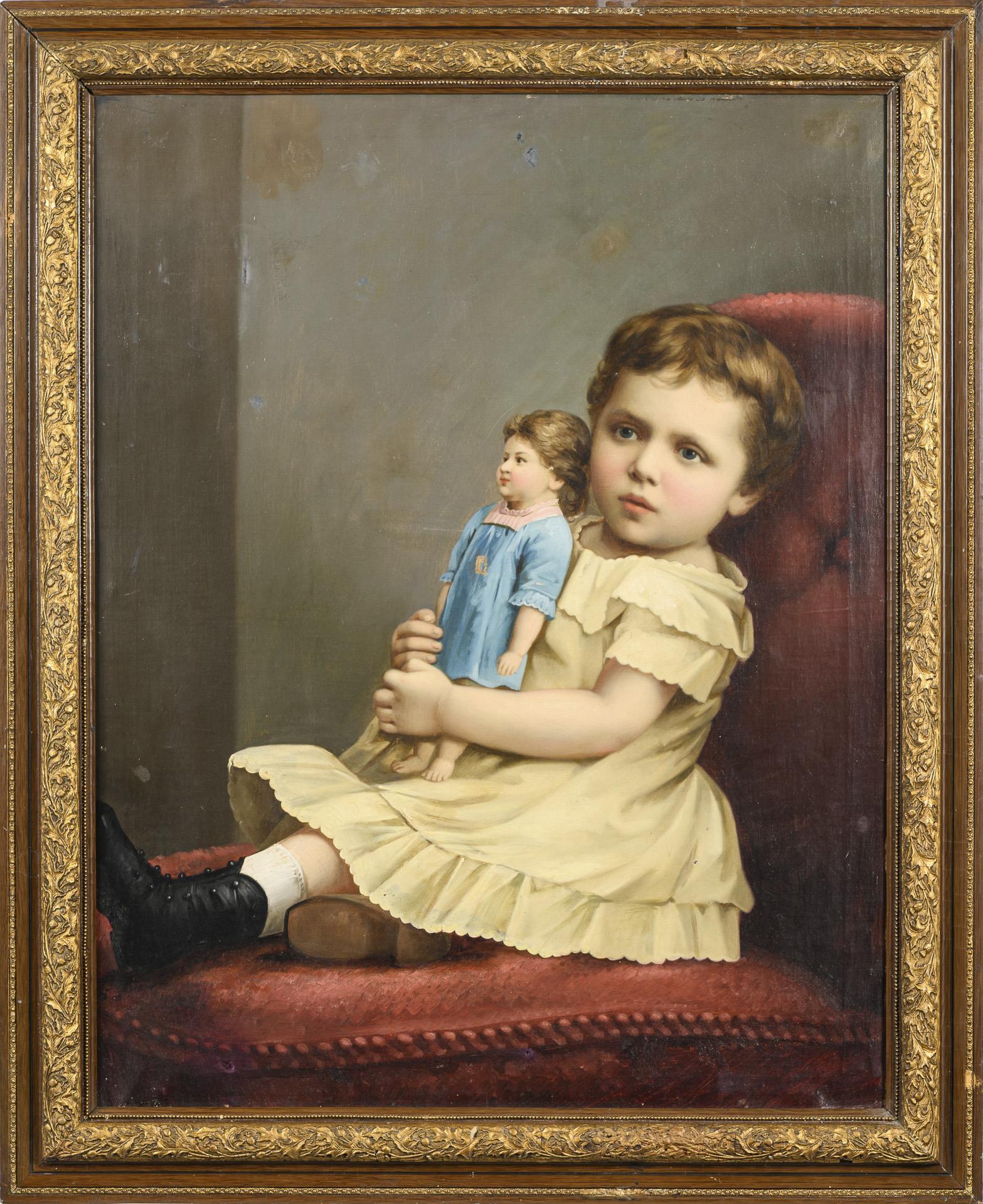Portrait of a child on a piece of upholstered furniture with a doll in her arms. Restored with backing.