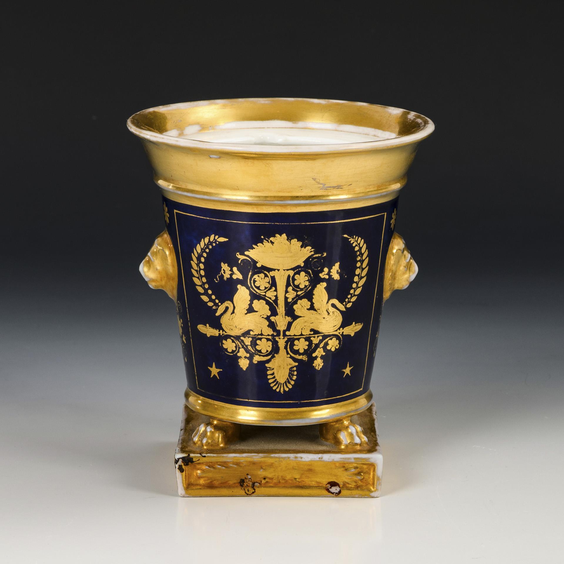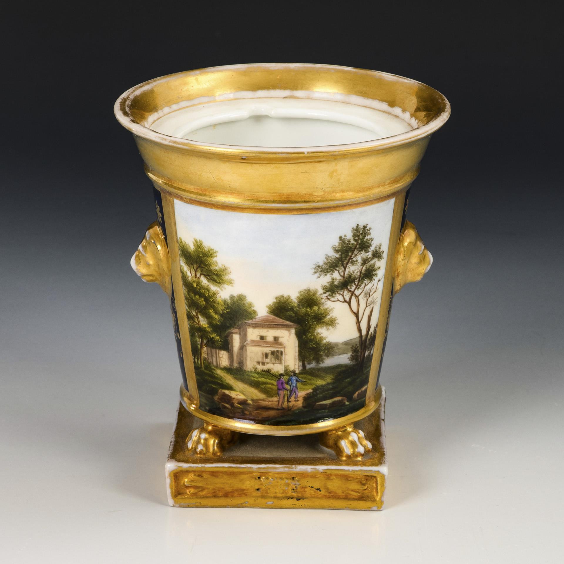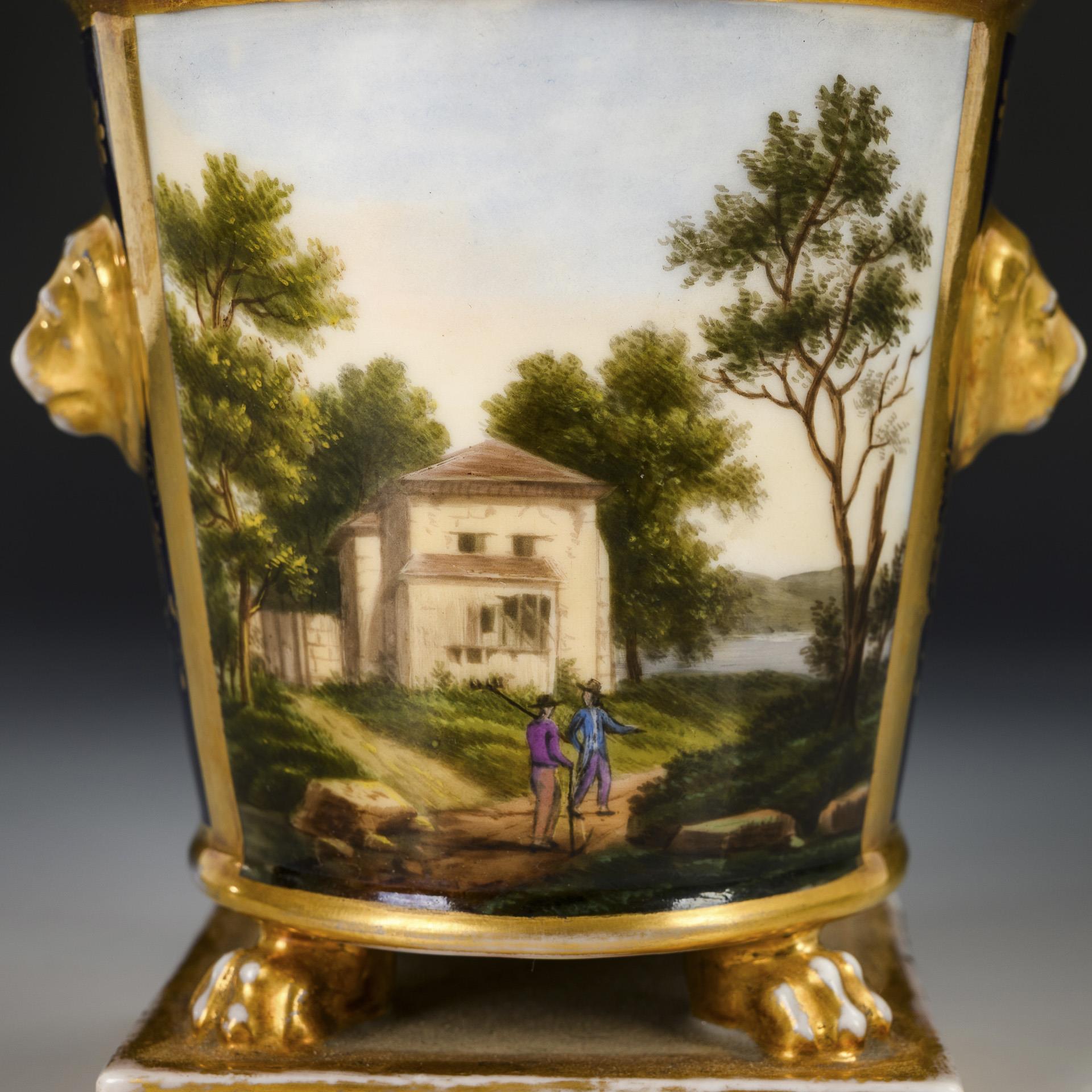 Conical body with crater rim, two lion's head mascarons and four paw feet, on a square plinth. On the front a gold-framed rectangular cartouche depicting a landscape with a house and two hikers, verso cobalt background with etched gold painting. Without lid. Hairline crack in the wall, partial gold abrasion.