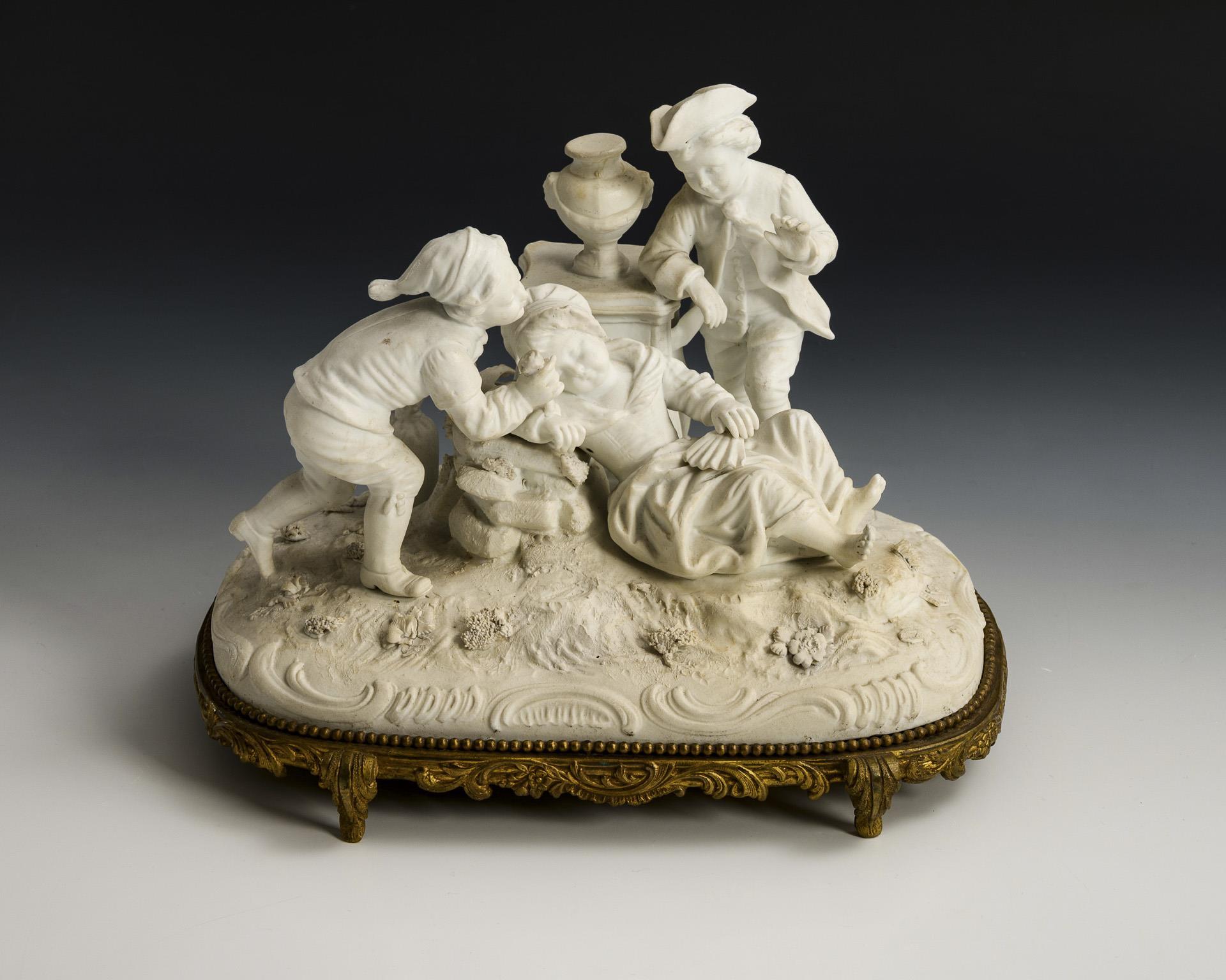 Depiction of two boys teasing a sleeping girl, with a four-footed bronze base in floral relief. 1 toe, 1 finger and rose in the hand of a boy restored.