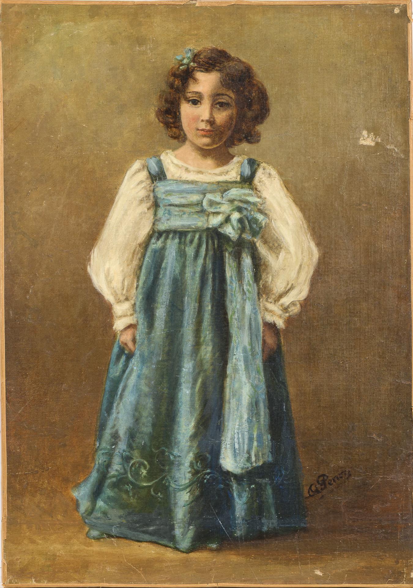 Portrait of a girl in a white and blue dress against a neutral background. Canvas doubled, scratches.