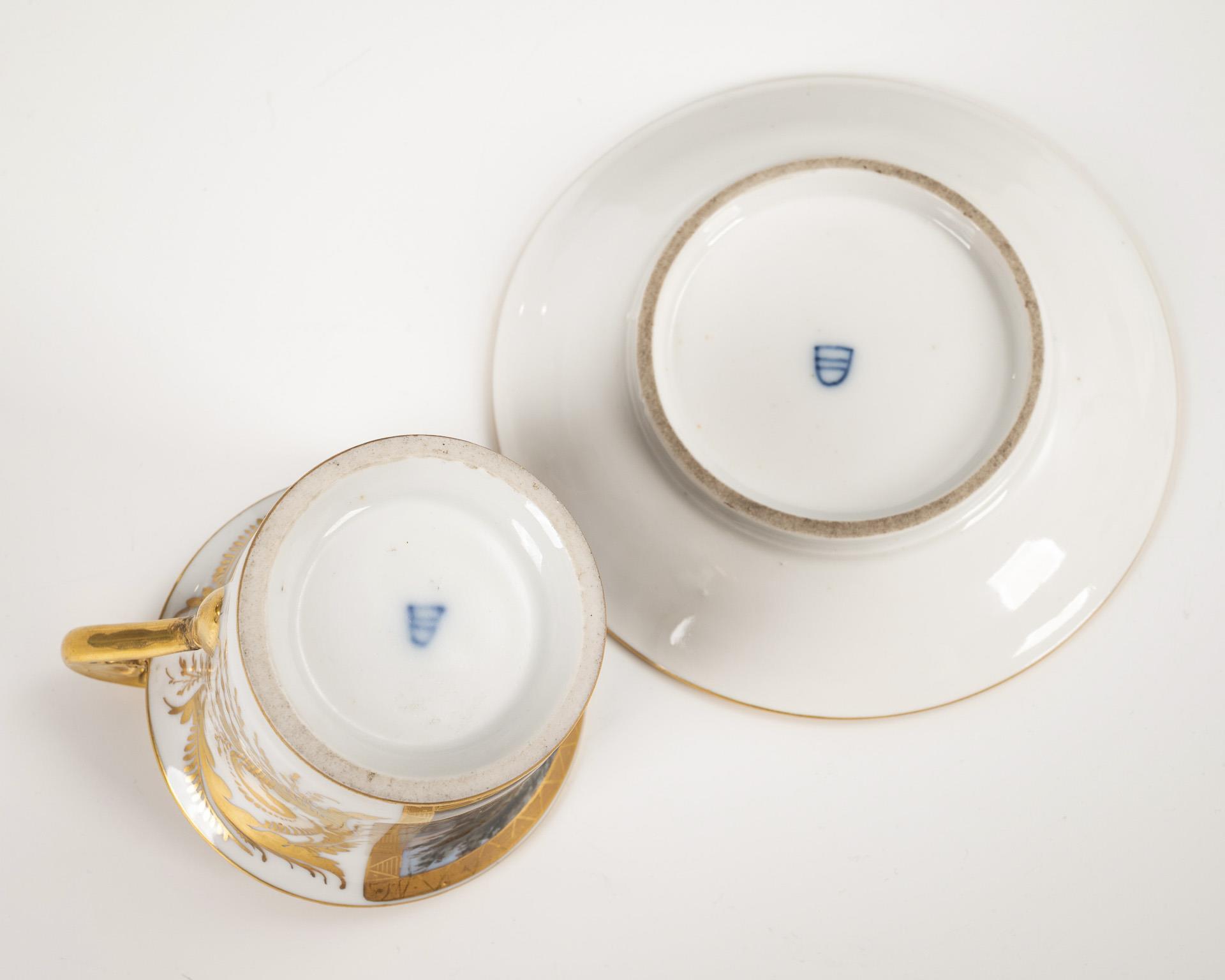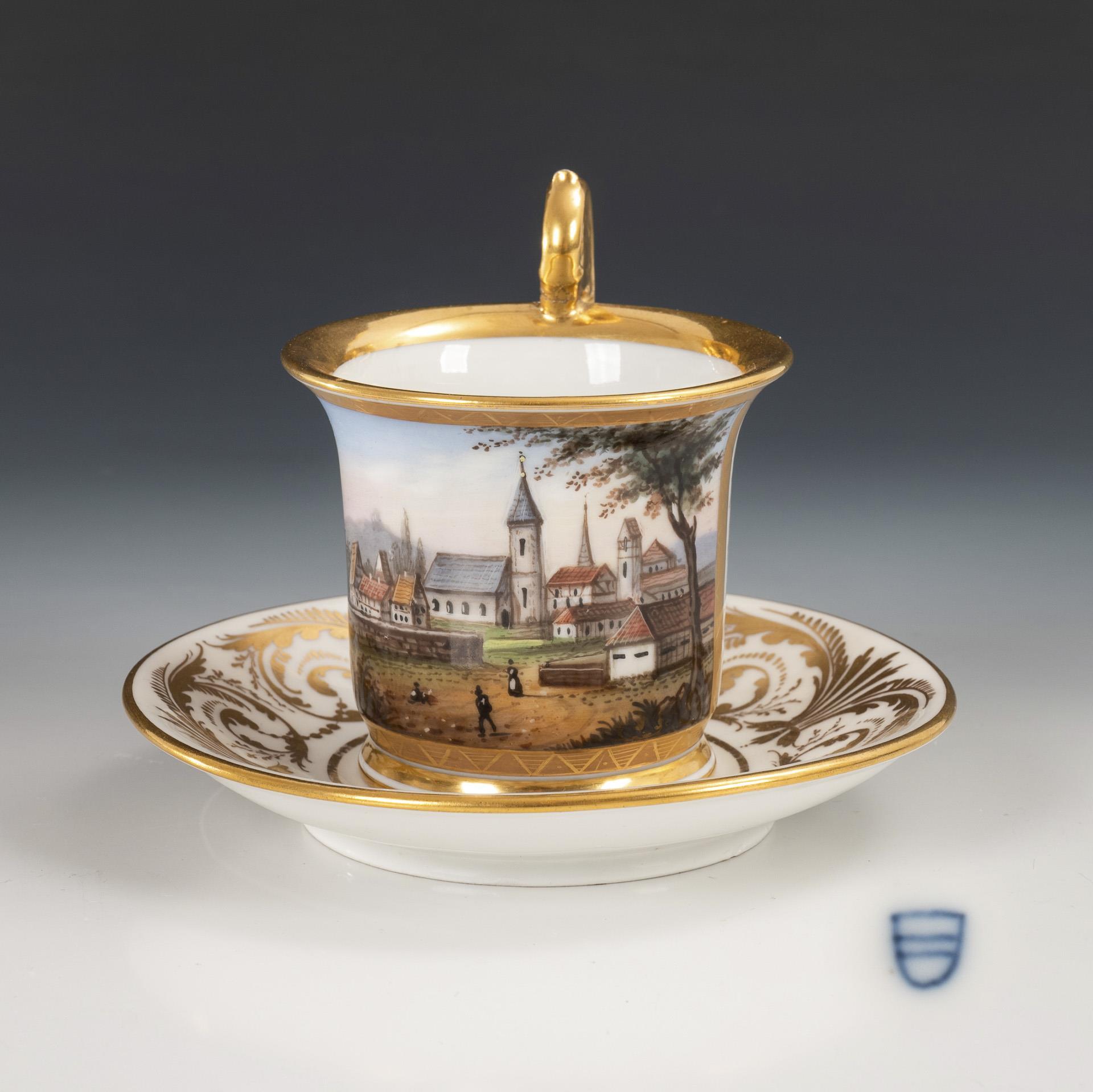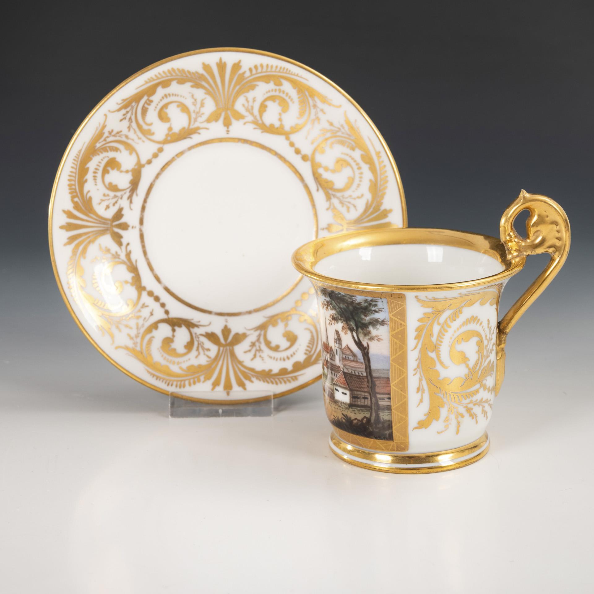 Polychrome painted, decorated in gold. Cup (h 10 cm), original saucer (Ø 14 cm).