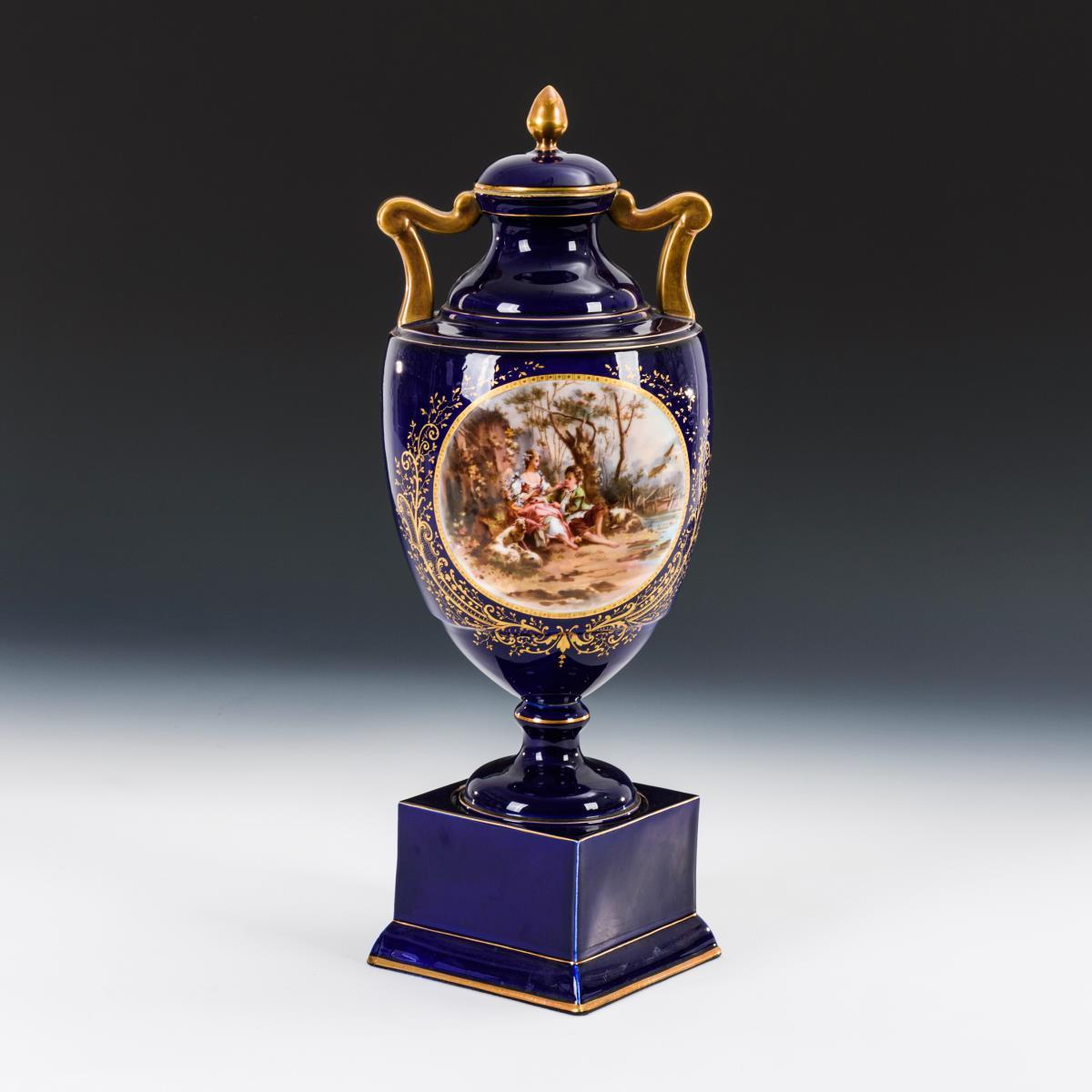 Ovoide Form mit zwei Henkeln, Knaufdeckel und Rundfuß. Mit quadratischem