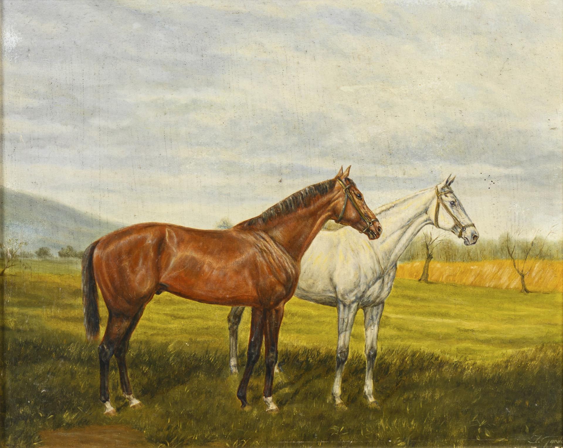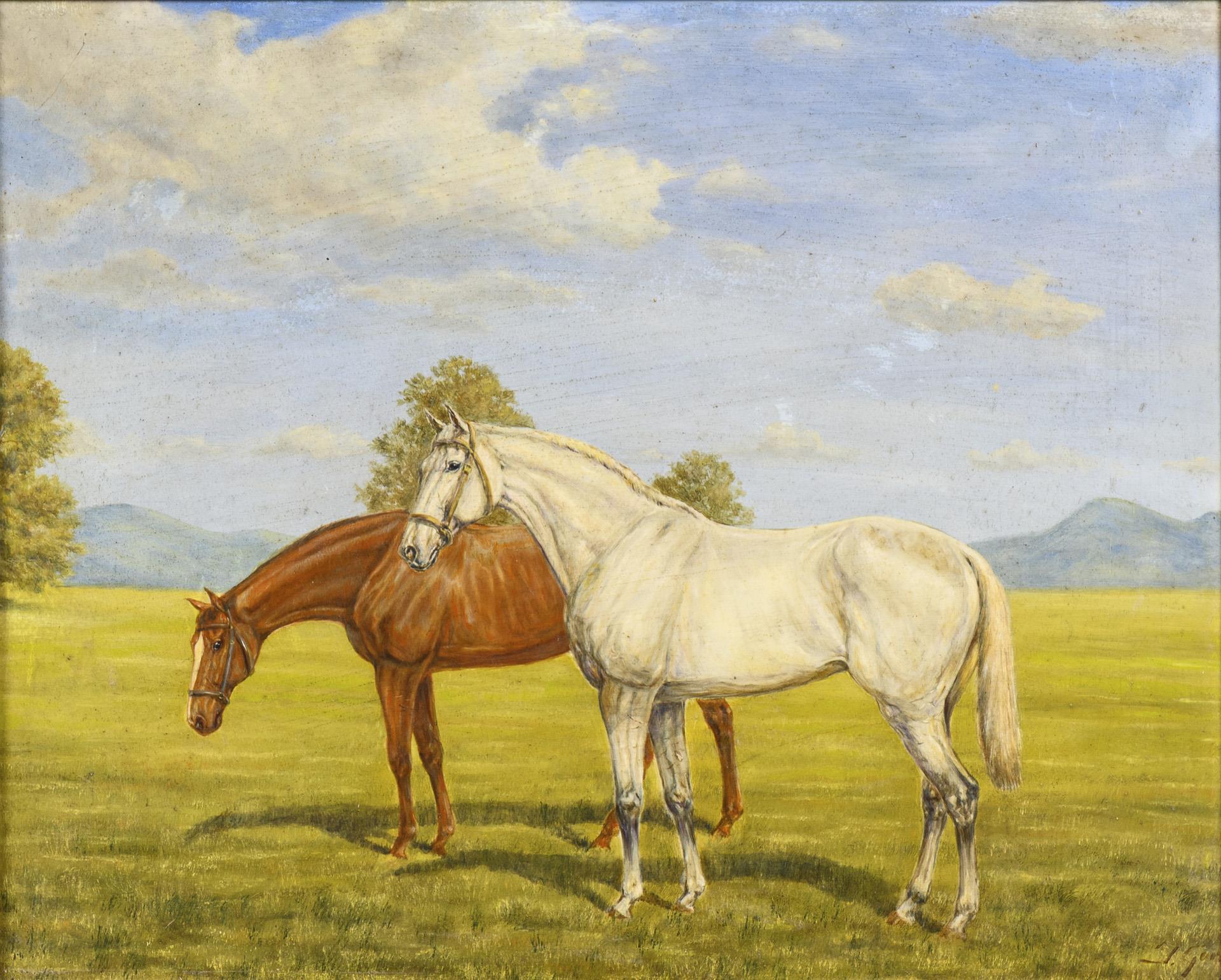 Each depicting two horses in a meadow on a sunny day. Minimal traces of age.