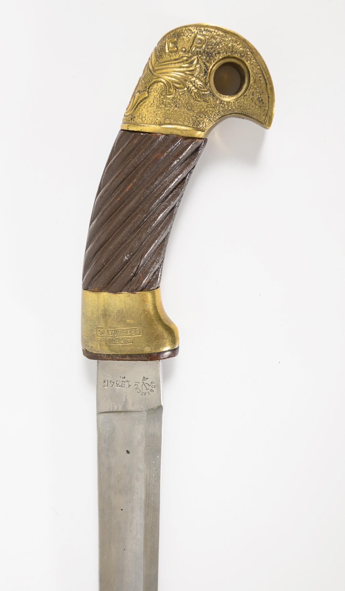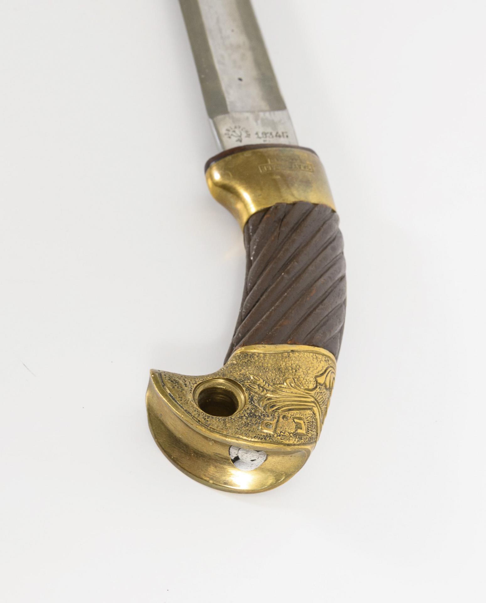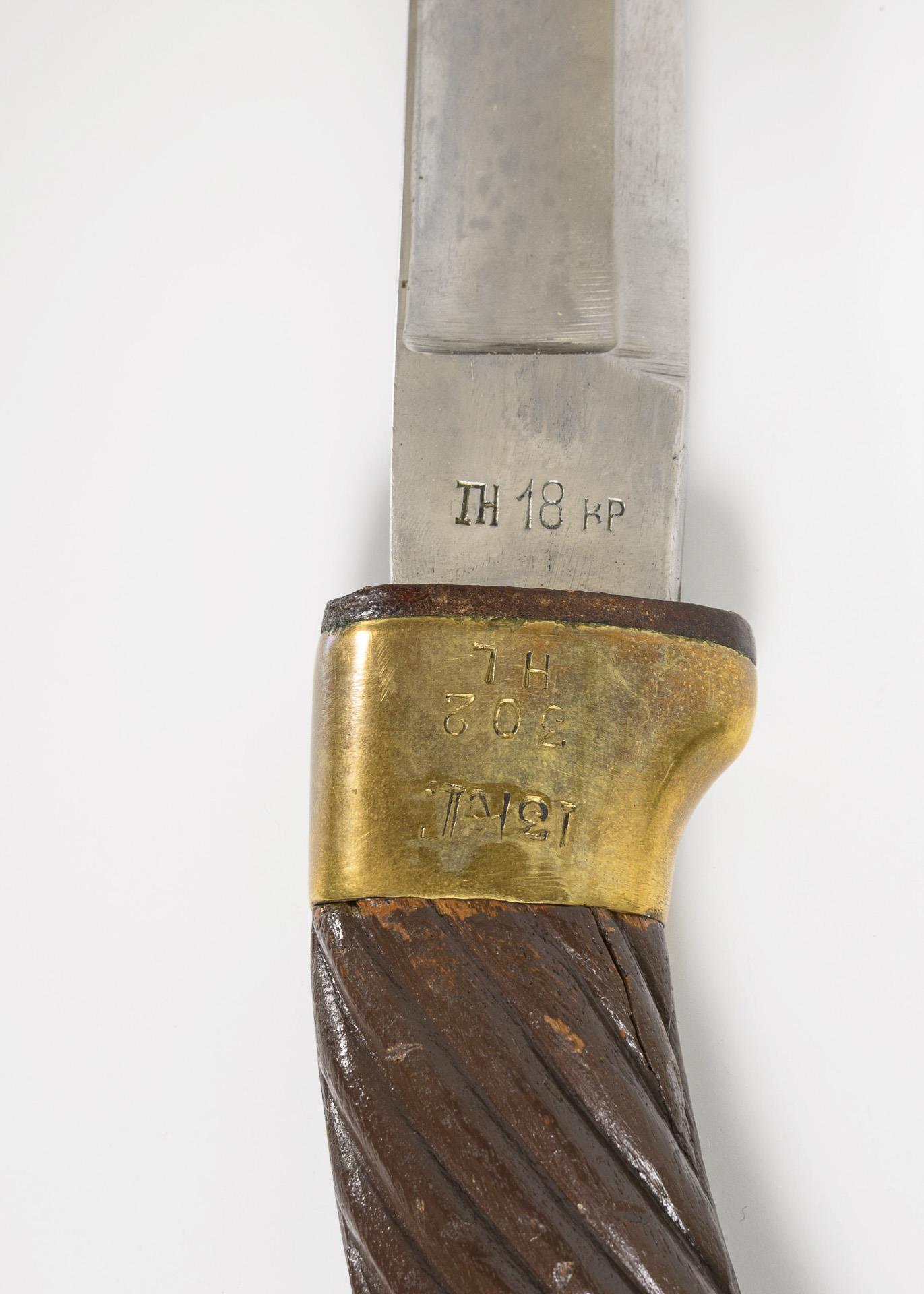 Bronze grip with hammer, sickle, Soviet star and "C.C.C.P." on the pommel cap as well as eyelet for the lanyard, diagonally ribbed wooden grip. Blade with fullers on both sides and a fuller. Dark dyed leather or imitation leather scabbard with brass mountings. Blued socket bayonet with square blade and screwdriver point. Grip repainted brown, otherwise minimal signs of age/use. Bayonet later originally replaced.