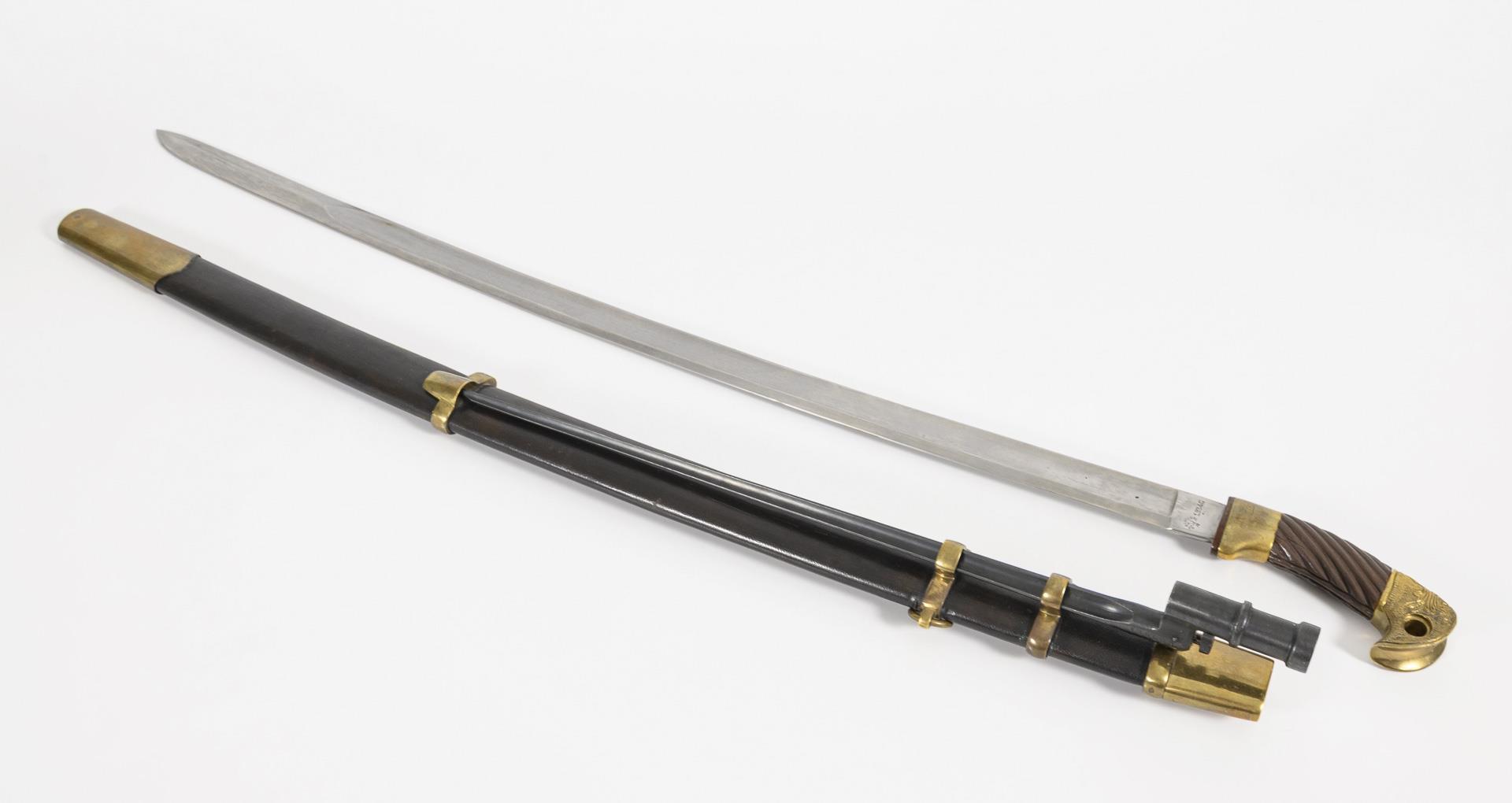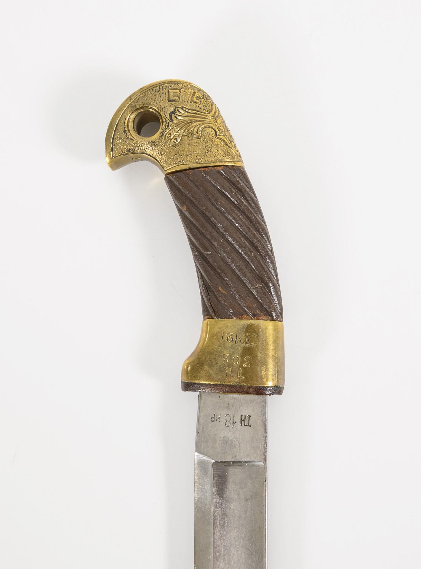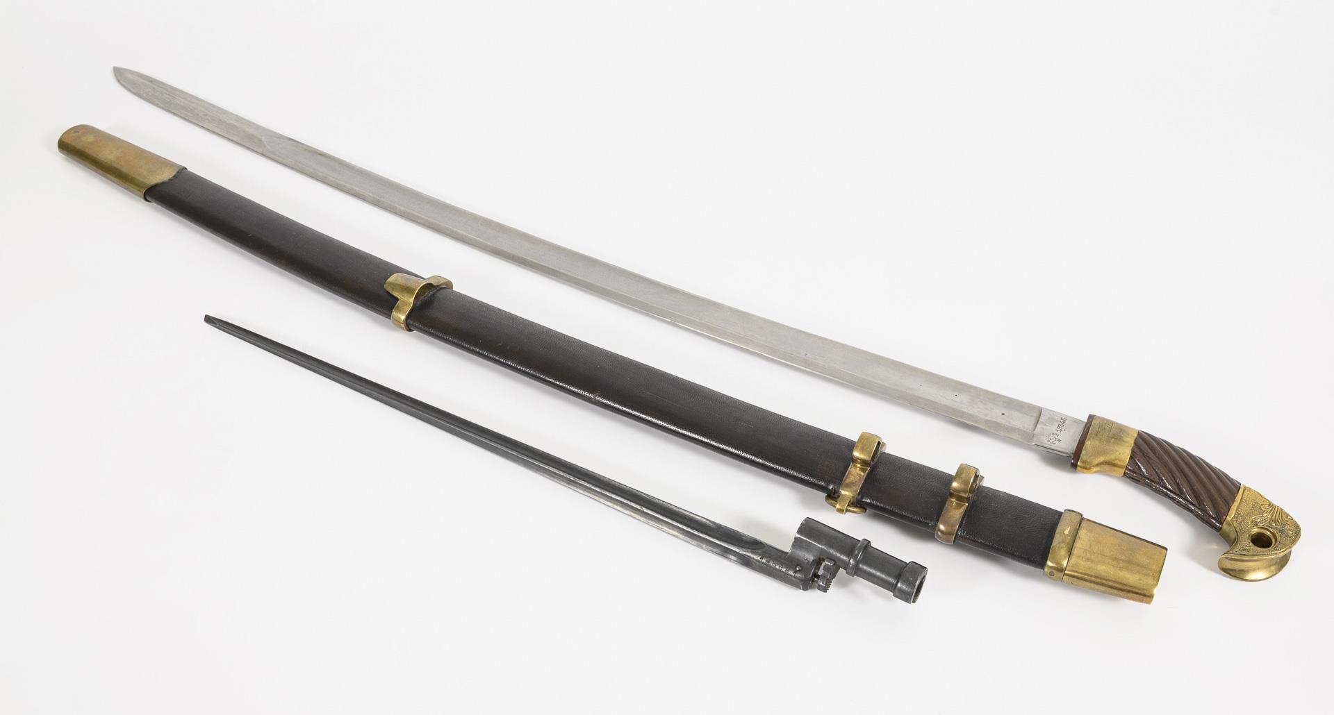 Bronze grip with hammer, sickle, Soviet star and "C.C.C.P." on the pommel cap as well as eyelet for the lanyard, diagonally ribbed wooden grip. Blade with fullers on both sides and a fuller. Dark dyed leather or imitation leather scabbard with brass mountings. Blued socket bayonet with square blade and screwdriver point. Grip repainted brown, otherwise minimal signs of age/use. Bayonet later originally replaced.