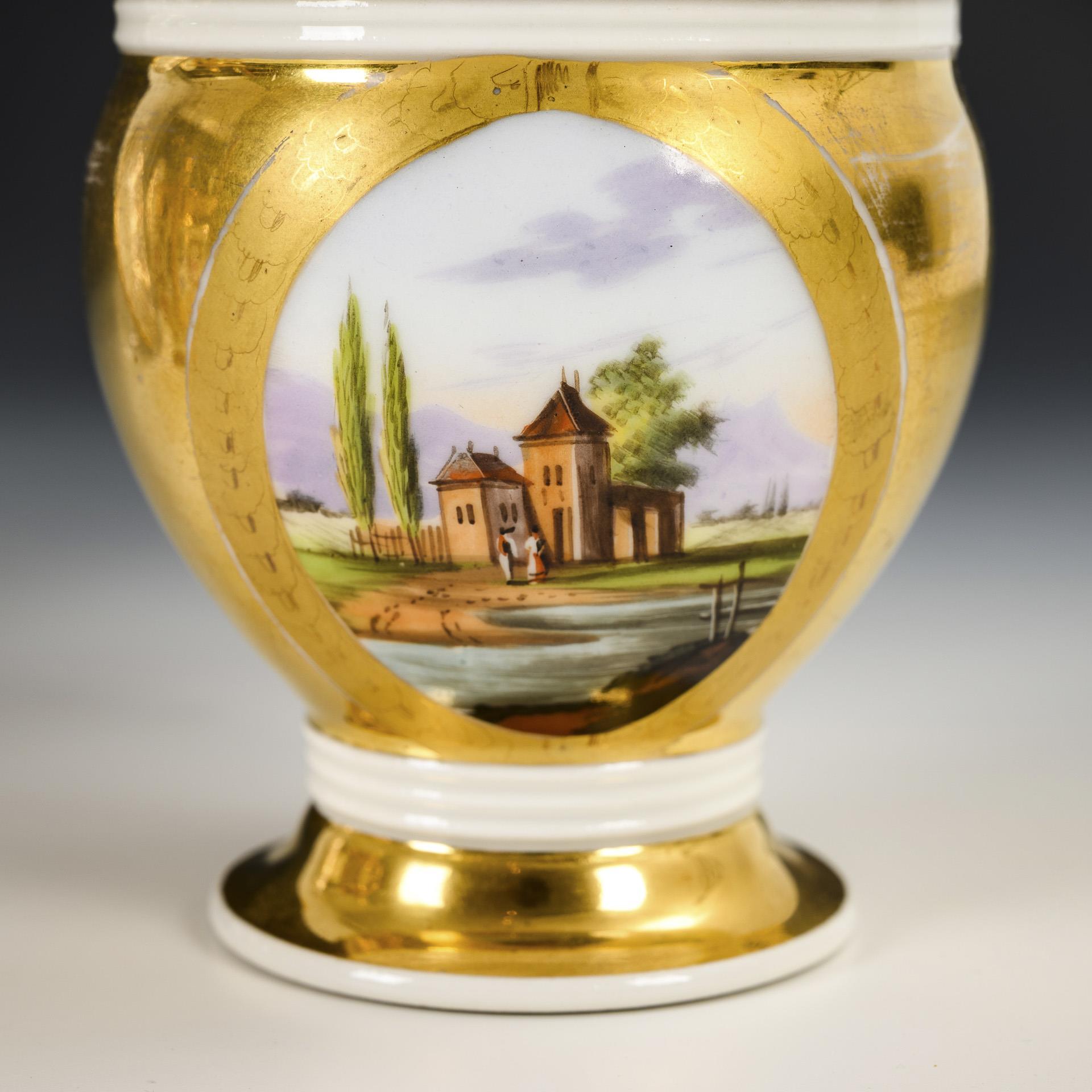 1x footed bell cup with swan handle and gold background, on the front a medallion with landscape painting / 1 footed polygonal bell cup with lion's head bisque handle and ornamental painting. Partial minimal gold wear.