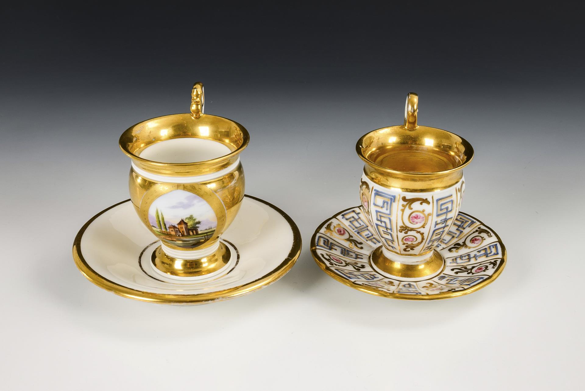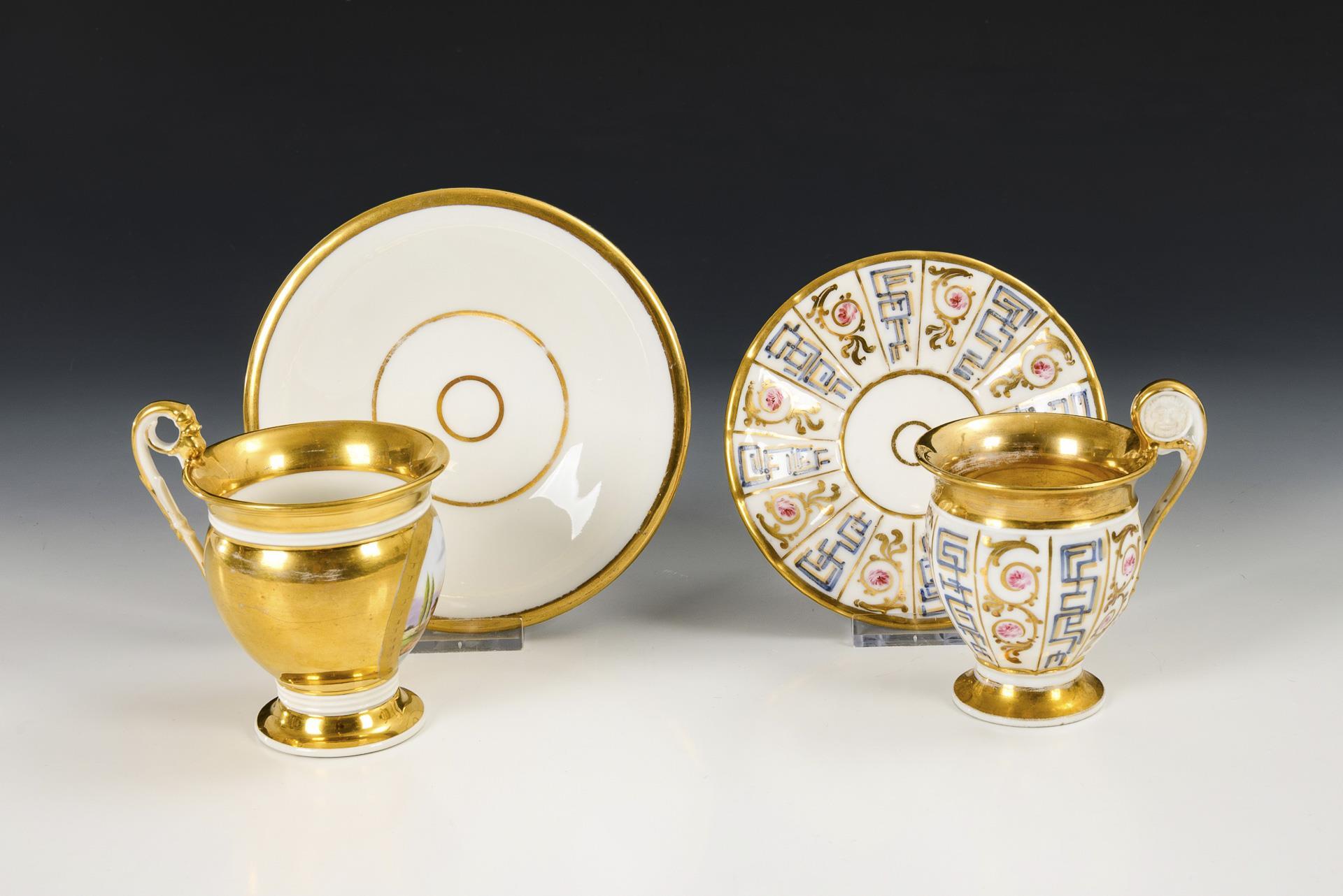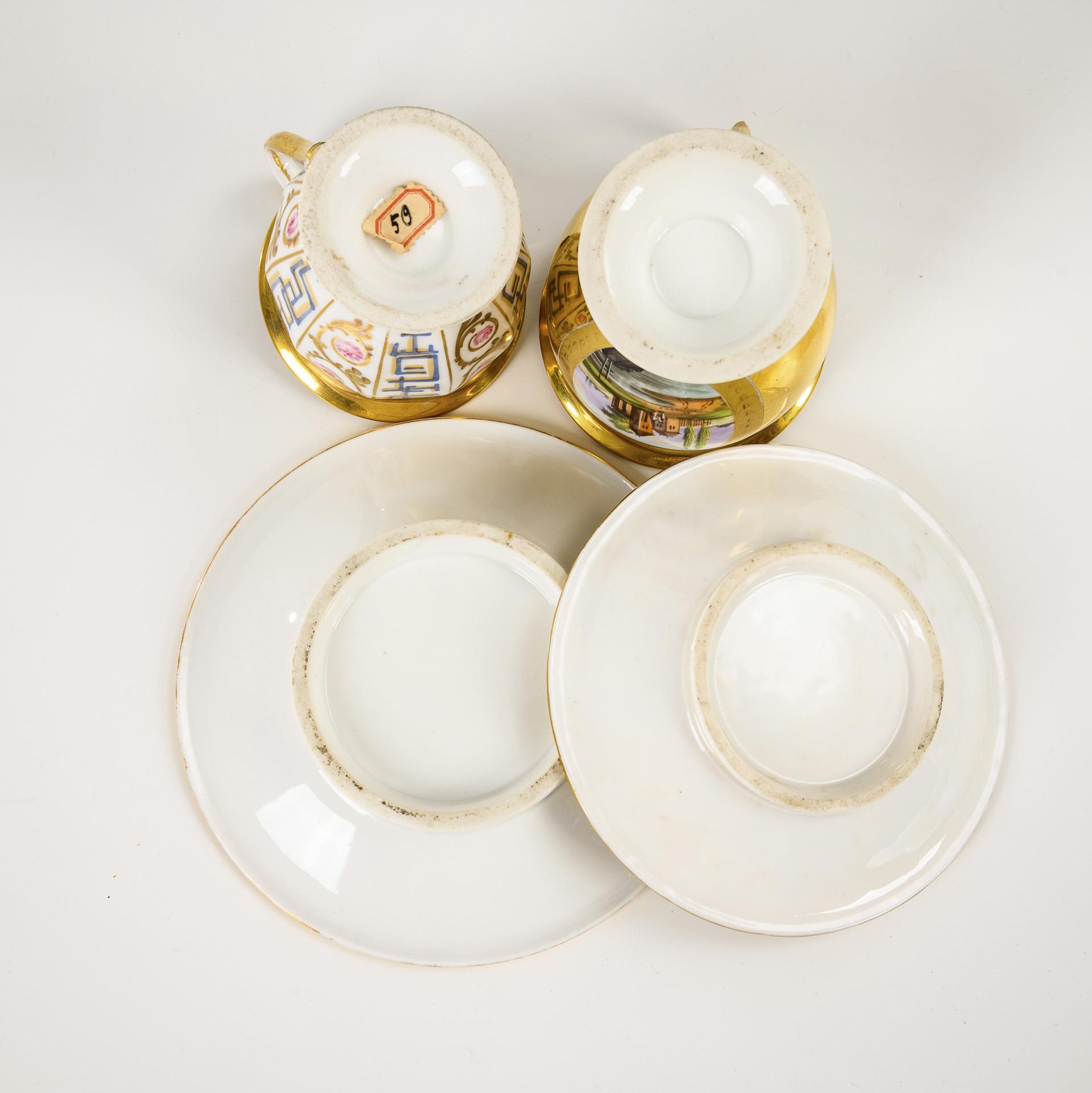 Polychrome painted, decorated with gold. 2 cups (h approx. 10.5 cm), 2 saucers (Ø 12.5 and 14.5 cm).