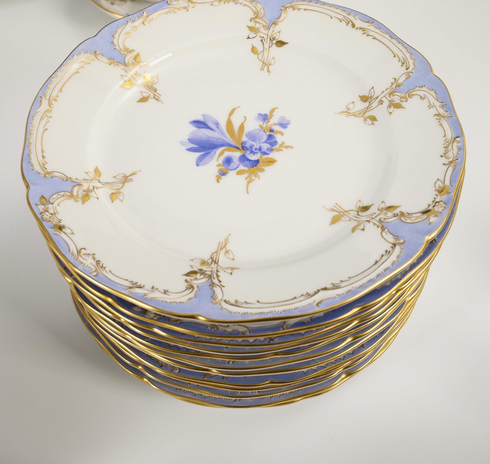 60 pieces. Model "Neuzierat". Coffee pot (h 26.5 cm), teapot (h 18 cm), 2 milk jugs, 2 sugar bowls, 9 demitasse cups with 9 saucers, 12 tea cups with 12 saucers and 12 breakfast plates.