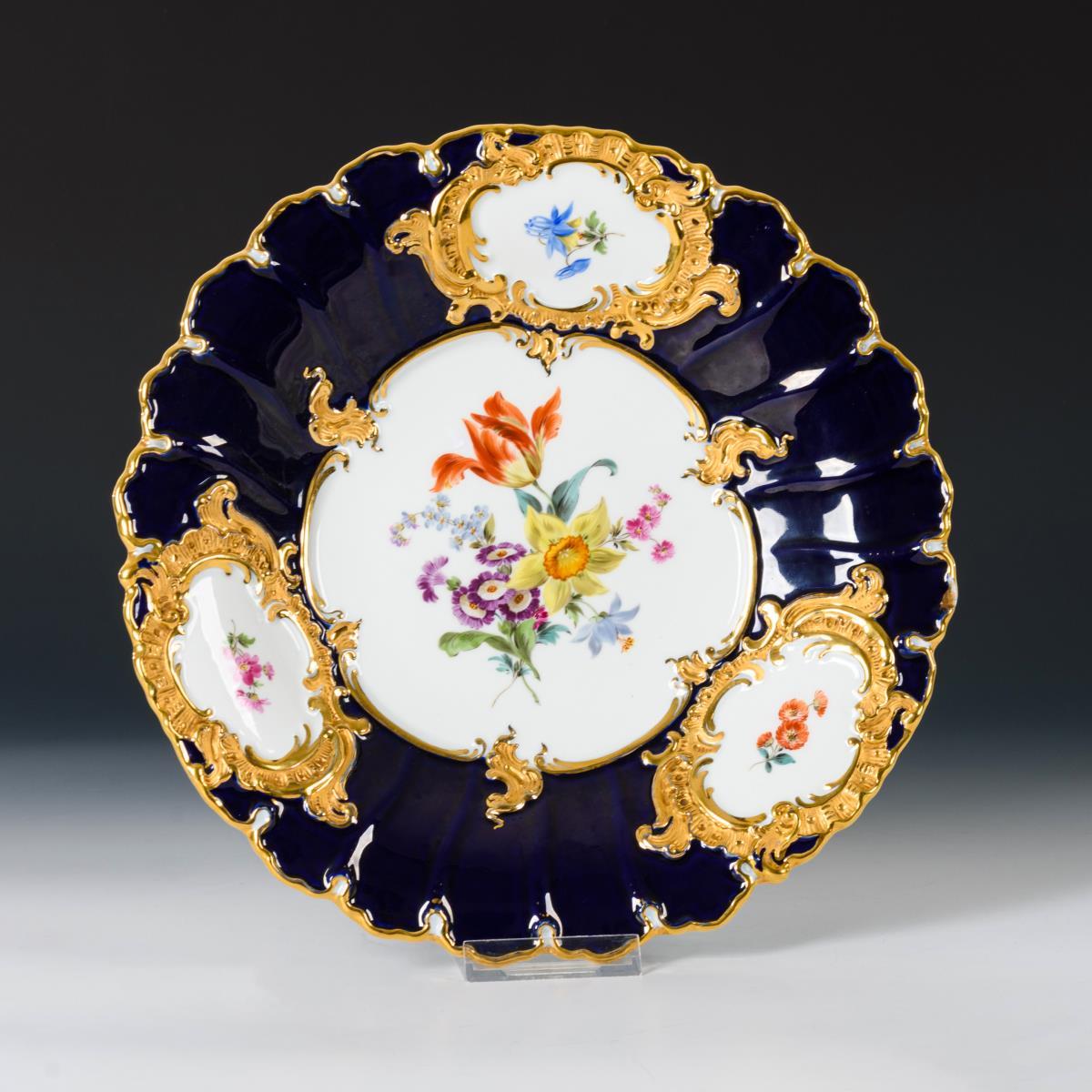 Kobaltblauer Fond, polychrome Blumenmalerei, Goldstaffage.
