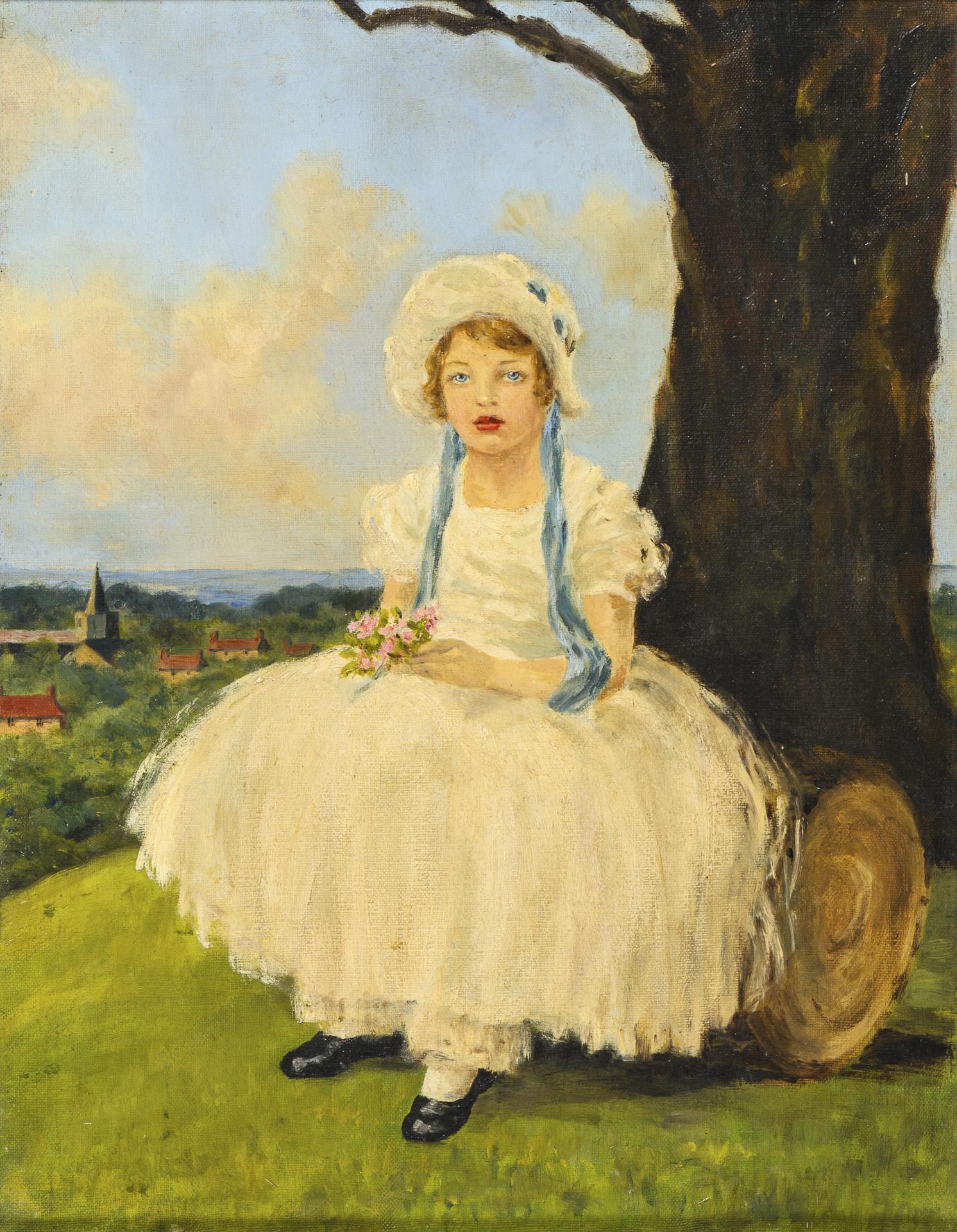 Full-length portrait of a girl in a white dress under a tree in the sunshine. Two small restored areas with adhesive backing.