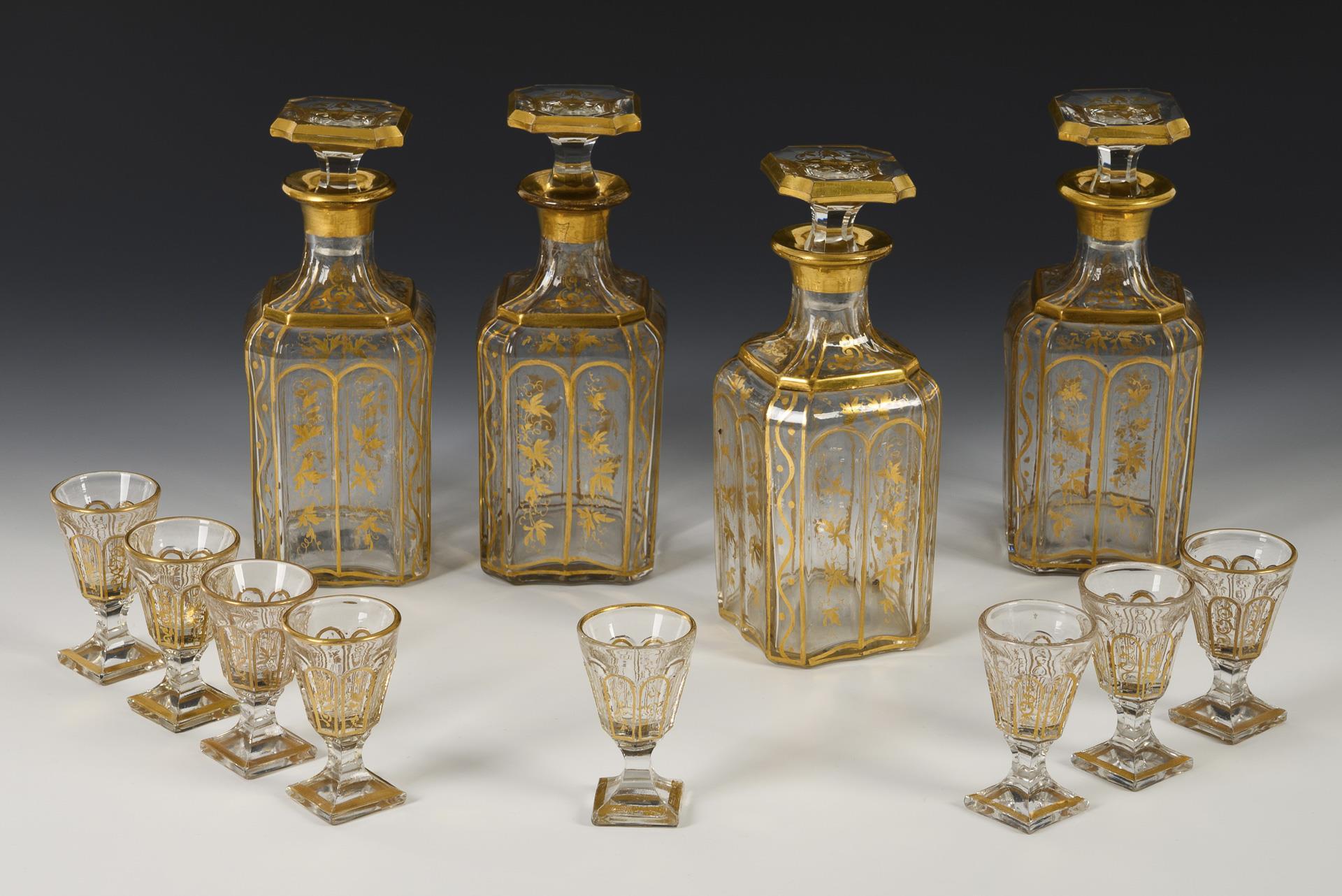 Colorless glass, gold decoration. 4 carafes (h 19 cm), 8 shot glasses (h 7.5 cm).