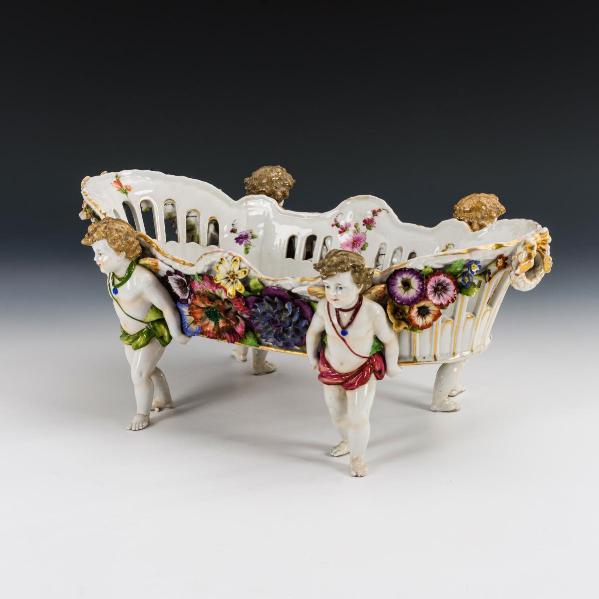 Von vier Putten getragene, ovale Durchbruchschale mit reichem Blütenbelag.