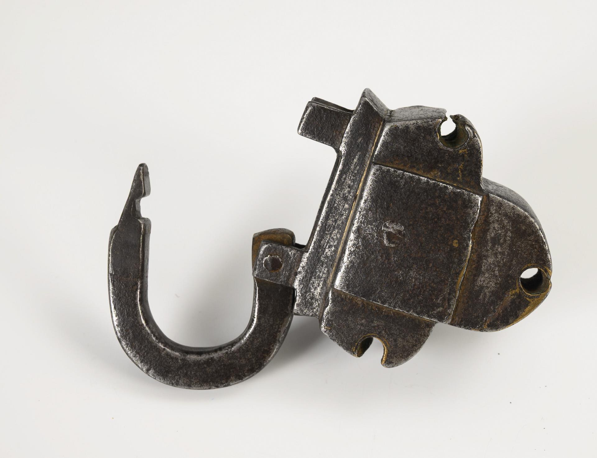 Wrought iron. H 3-pass lock 11 cm, Ø ball lock 4.5 cm (without shackle). Total weight 1.2 kg.