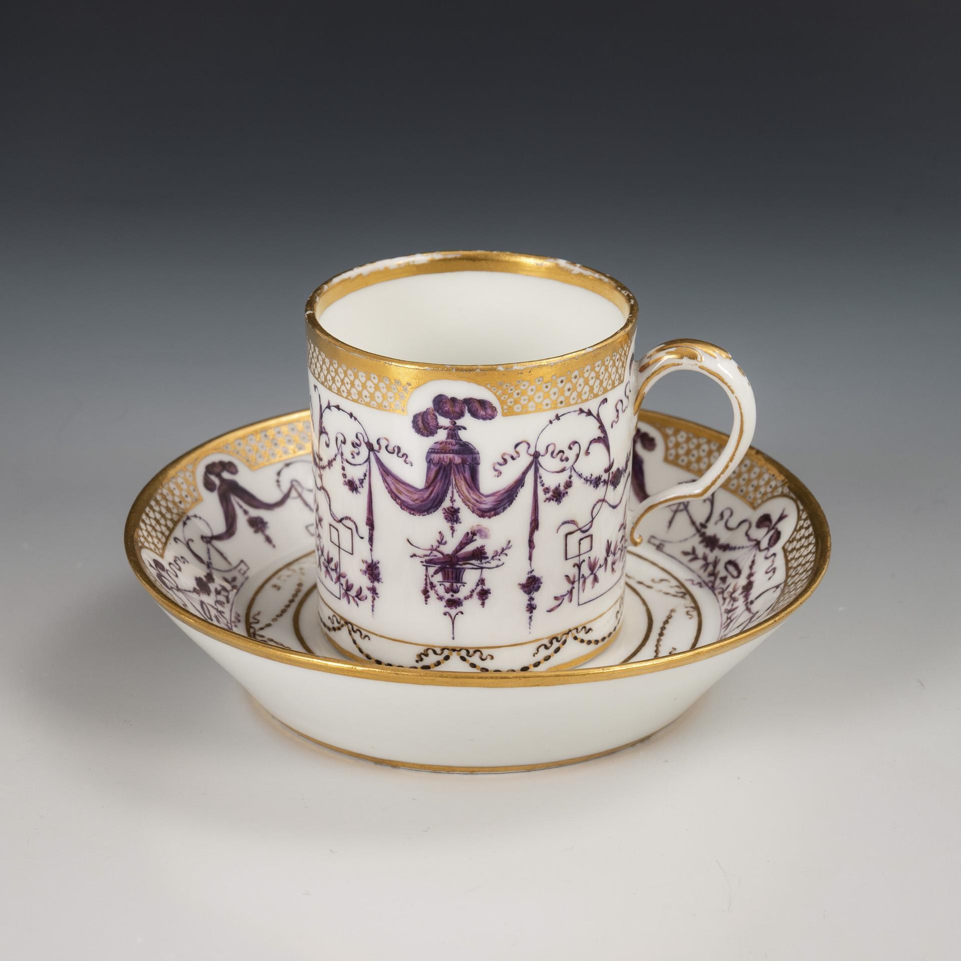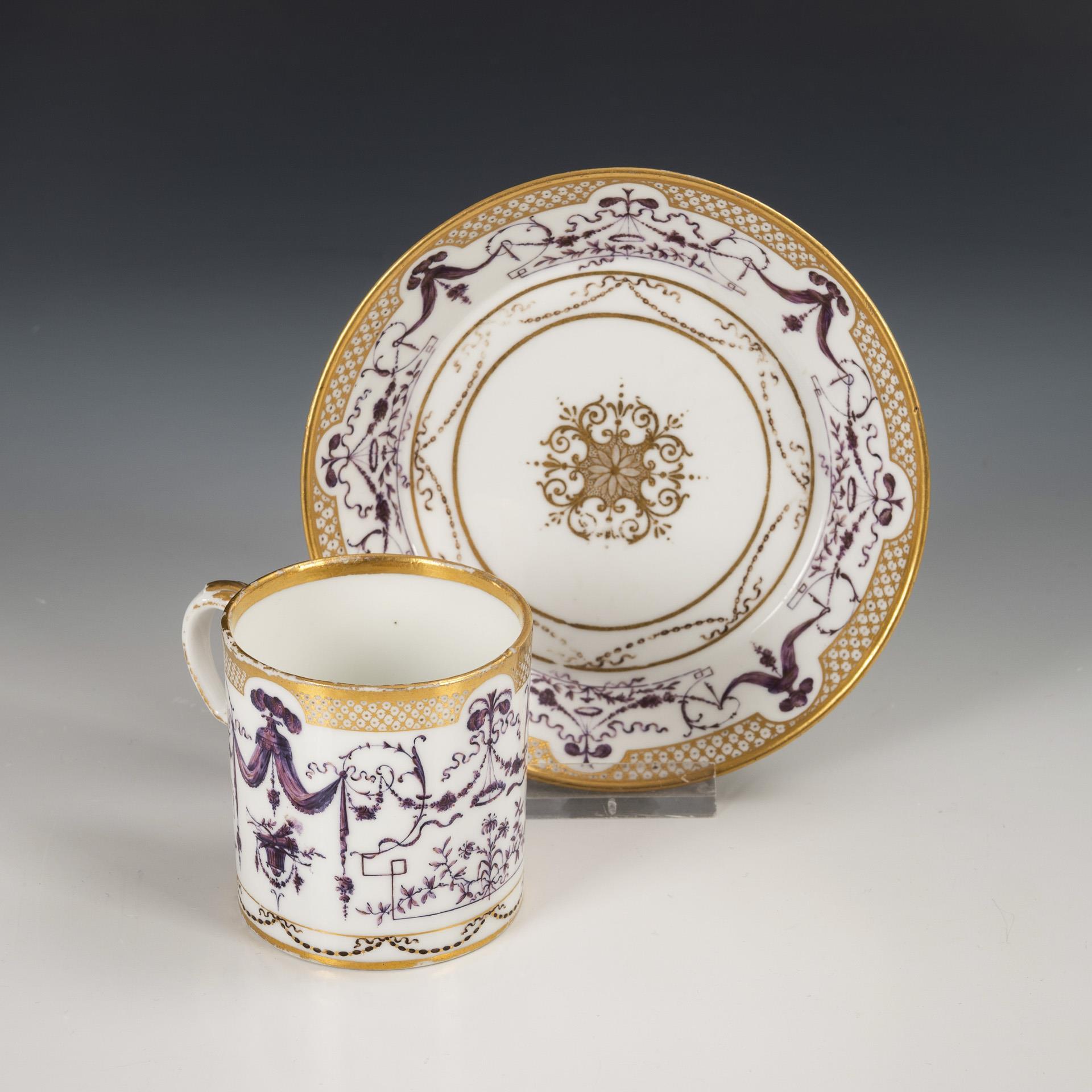 Cylinder cup with ear handle. Painted all around in purple with garlands, symbols and tendrils under a gold lattice border. Hairline crack in the handle, partial gold abrasion.