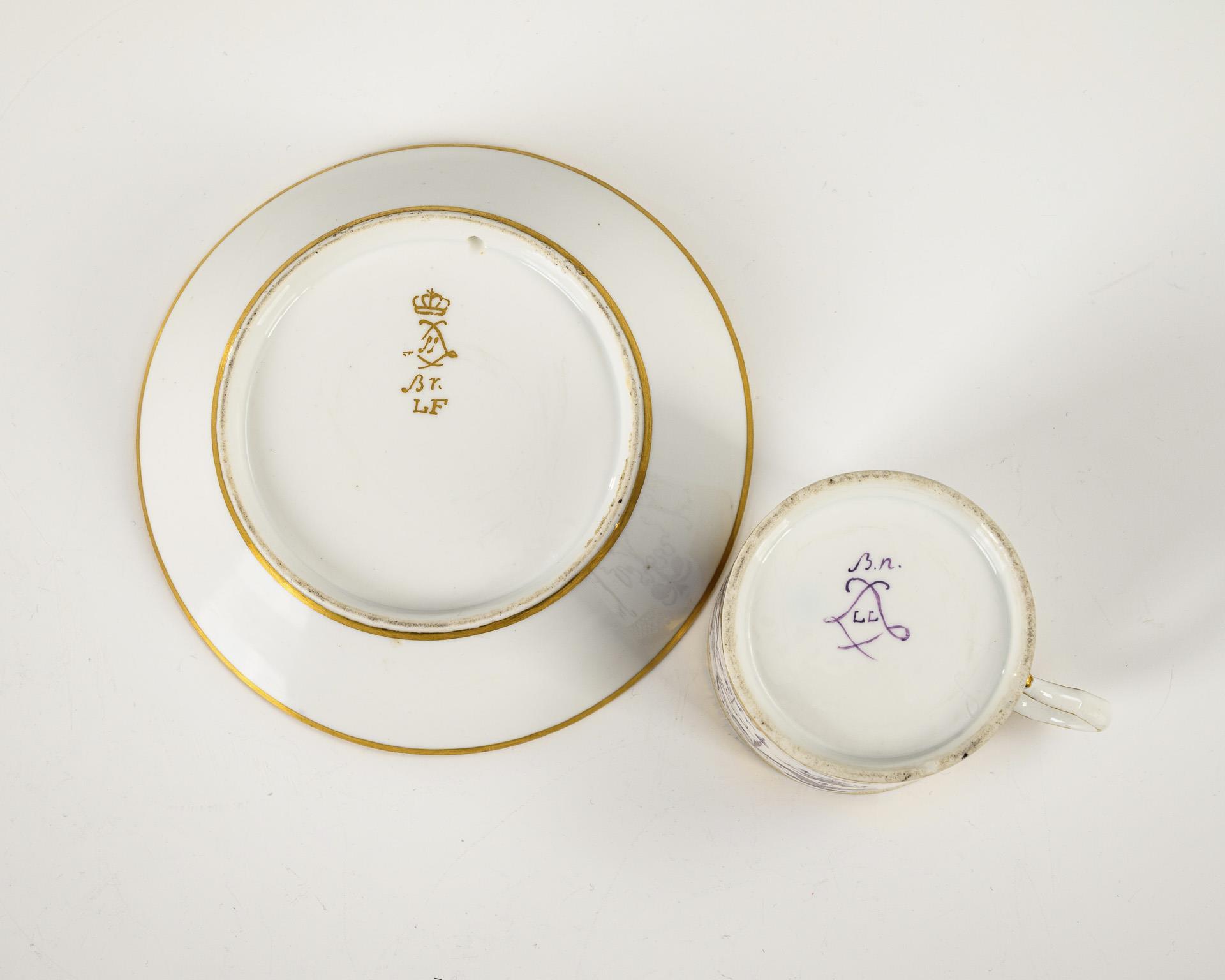 Polychrome painted, decorated with gold. Cup (h 6 cm), original saucer (Ø 12 cm).