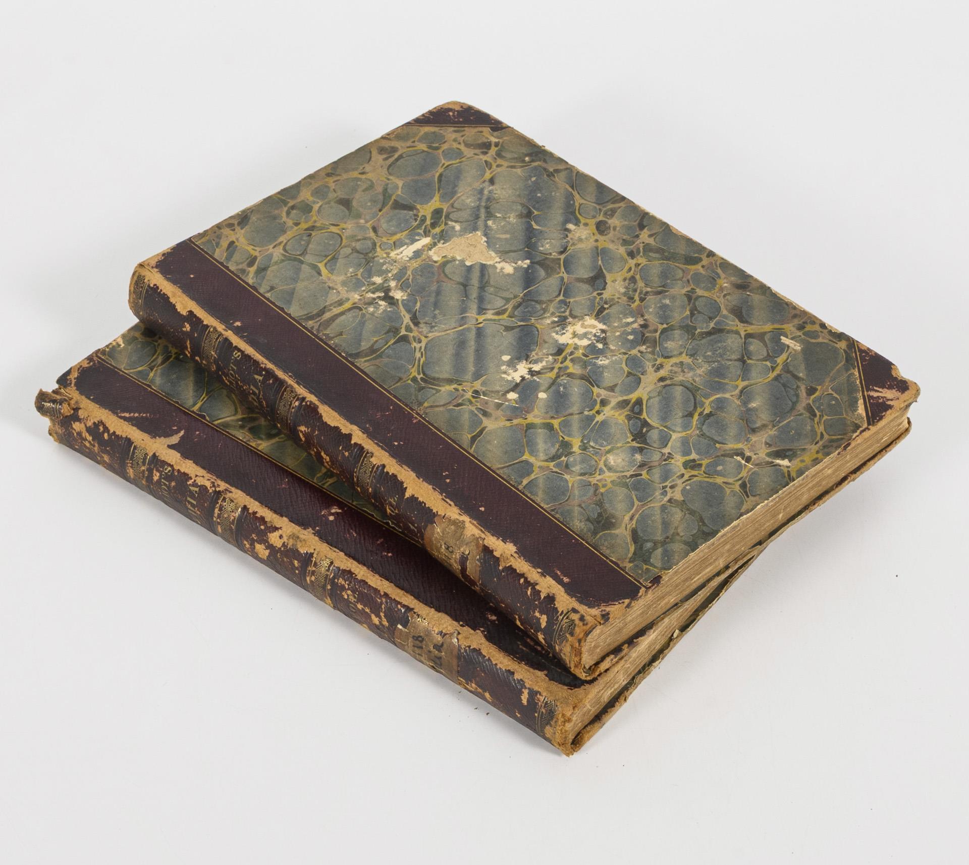 Each book with 30 steel engravings (complete), each with 4 pages of description, in half leather binding. Binding heavily rubbed, block foxed.