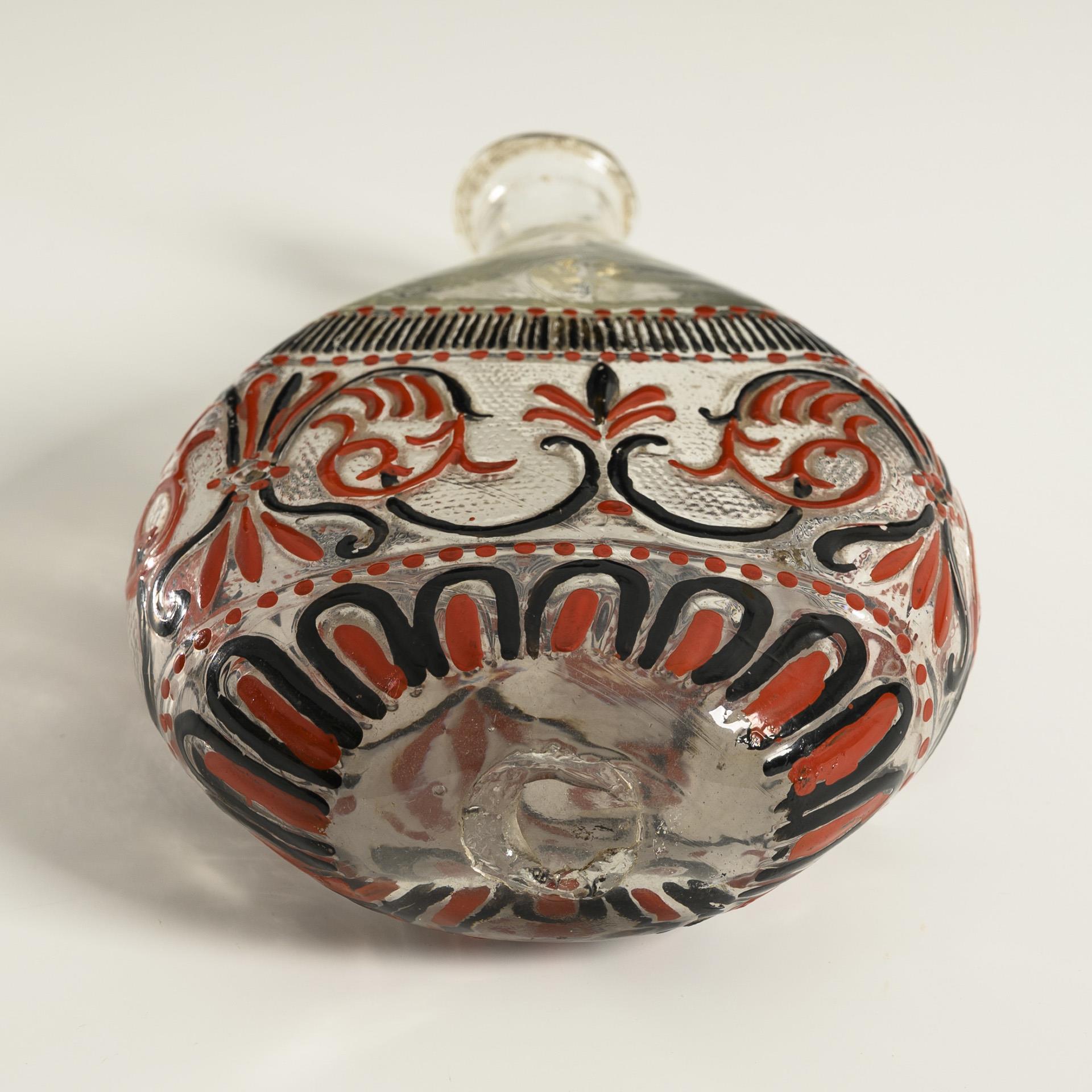 Shaped blown flat bottle made of colorless glass with ornamental, raised enamel painting in red and black; pontil mark. Stress crack in the body.
