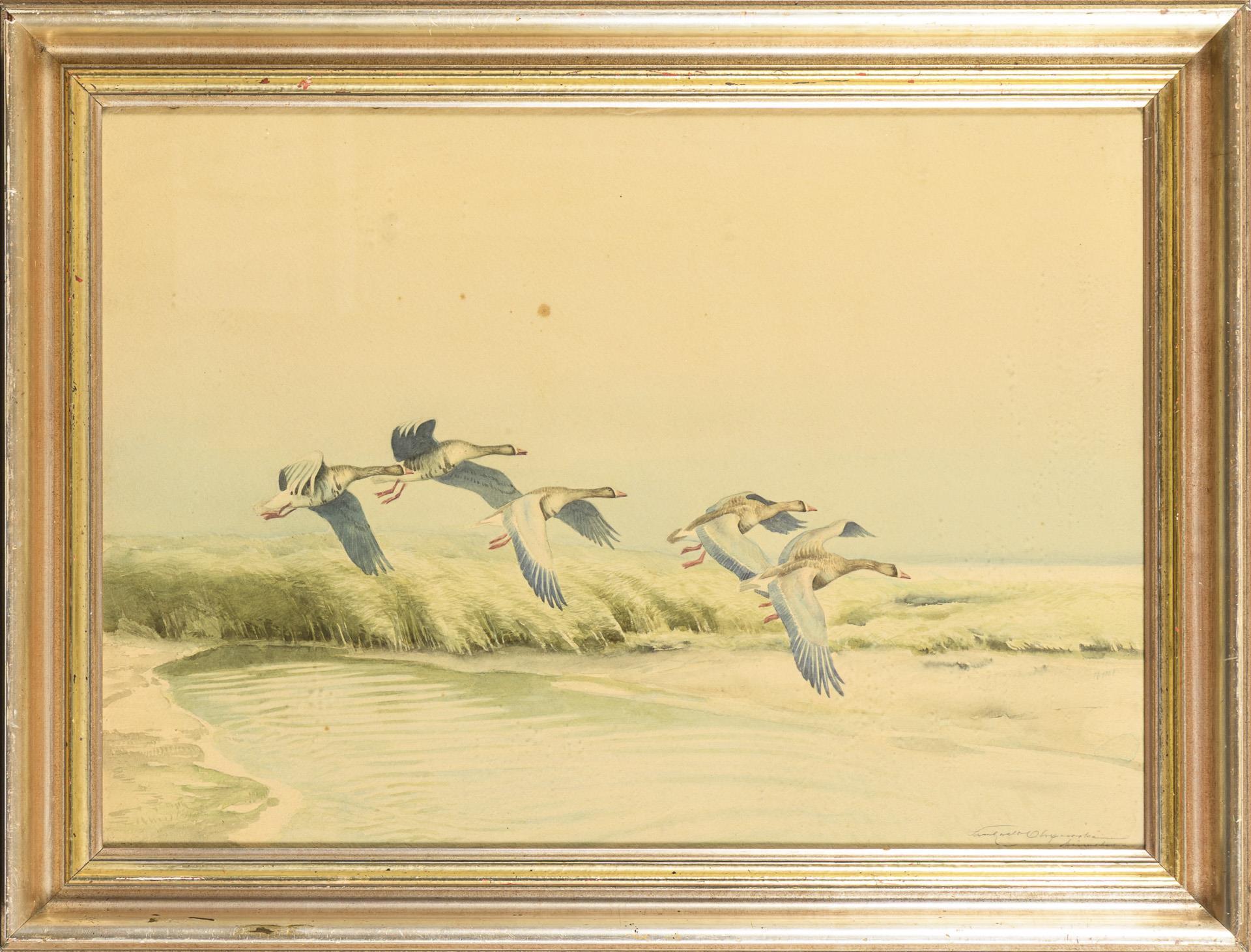 The animals in flight over the overgrown dunes in the sunshine. Slight foxing.