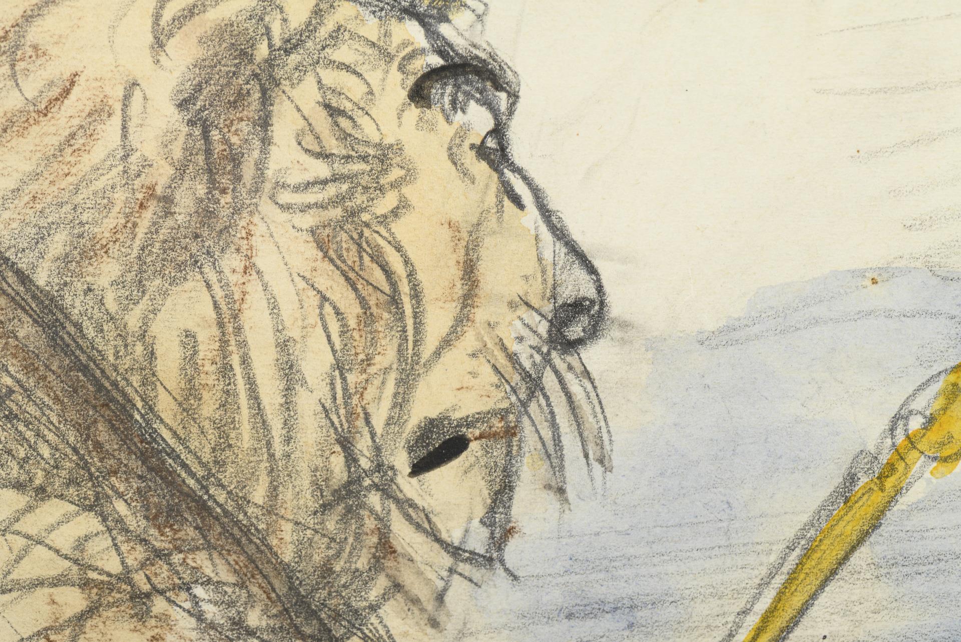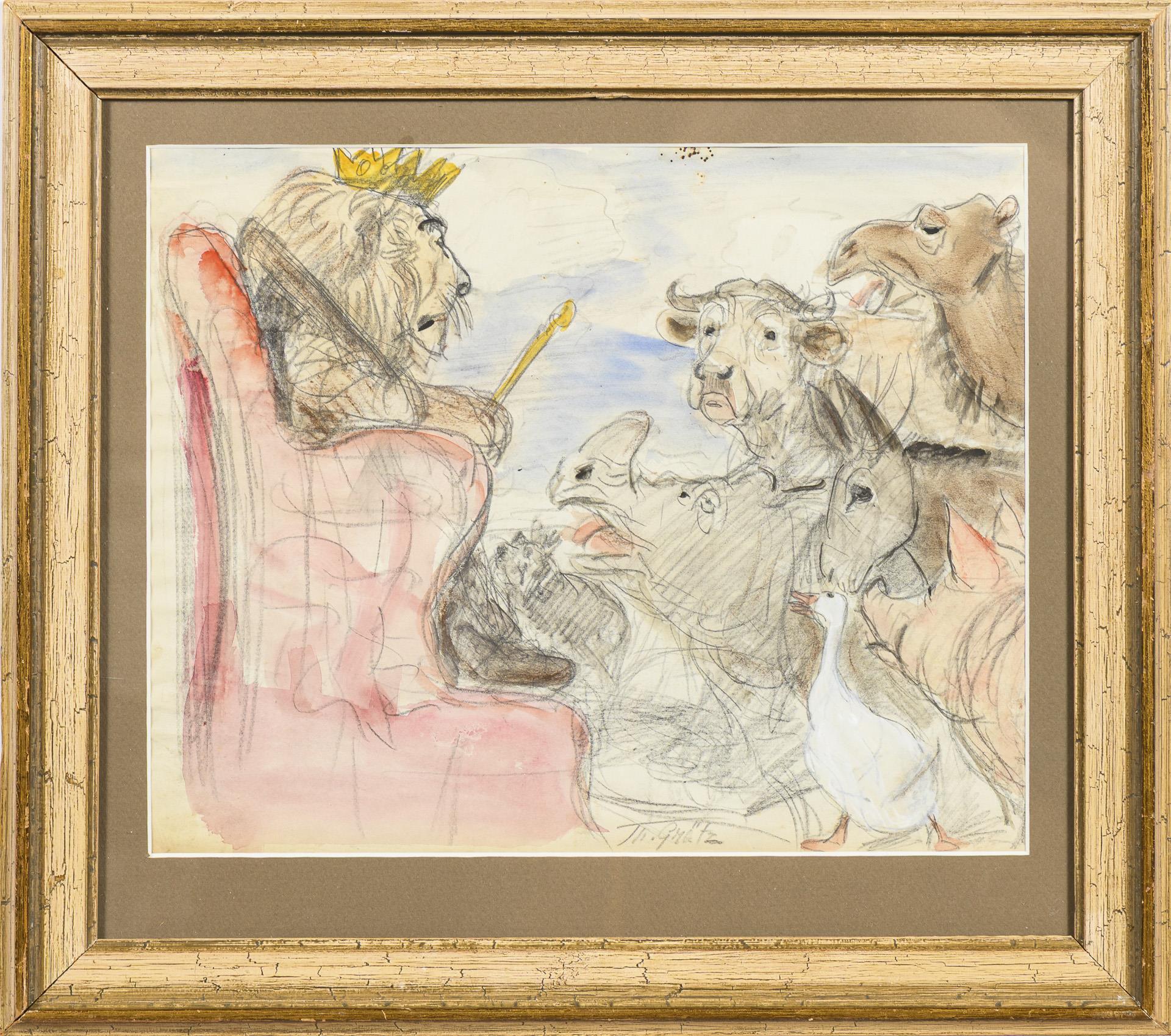The lion with crown and sceptre on a red throne, surrounded by densely packed animals. Slight traces of age.