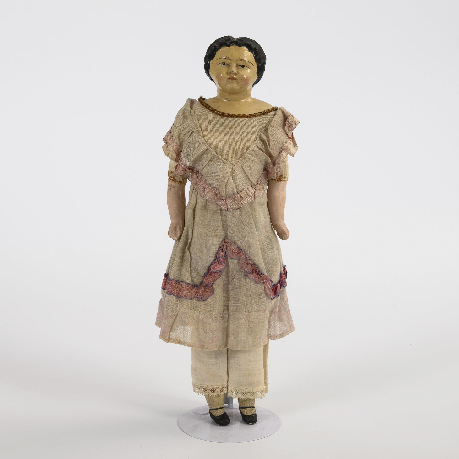 Carved head with painted blue eyes and black hair. Cloth body with mass links. Light dress, modeled shoes and stockings. Slight signs of age.