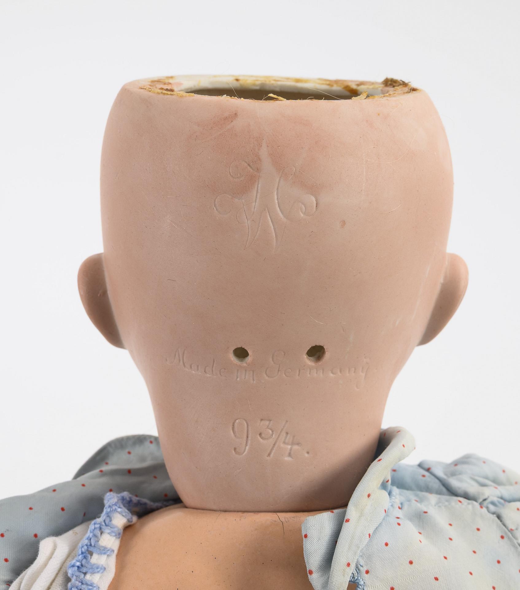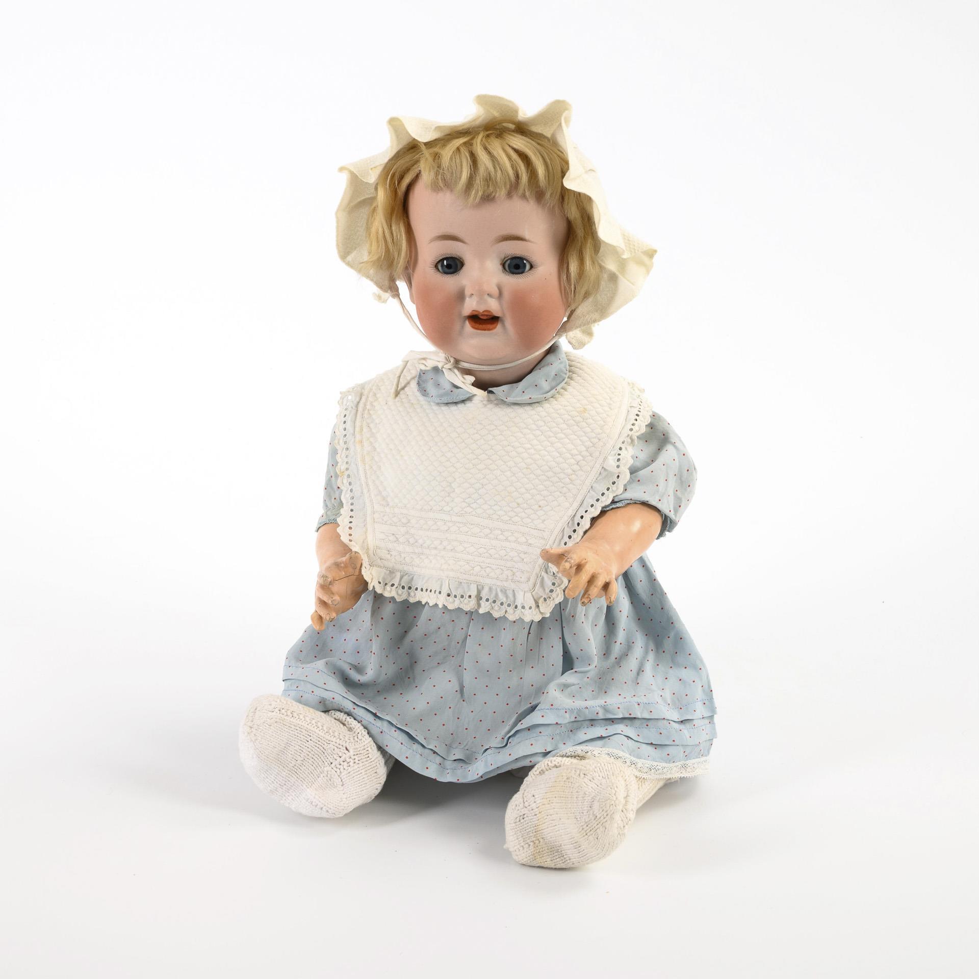 Cranked head, blue sleeping eyes, 1 tooth, movable tongue, blond mohair wig. 5-part sitting baby body with intact voice, blue dress and white bonnet. Head x-rayed: without defects, only minimal paint abrasion on the left temple. 2 fingers repaired, one hand cracked.
