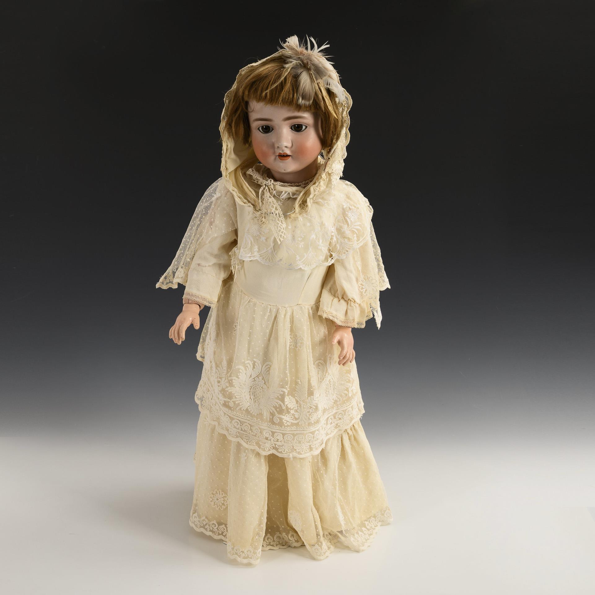 Cranked head, brown sleeping eyes, medium blond human hair wig, 13-part jointed body, long cream-colored dress, matching bonnet. Head x-rayed: without cracks, only small chips to the neck crank. Body partially painted over.