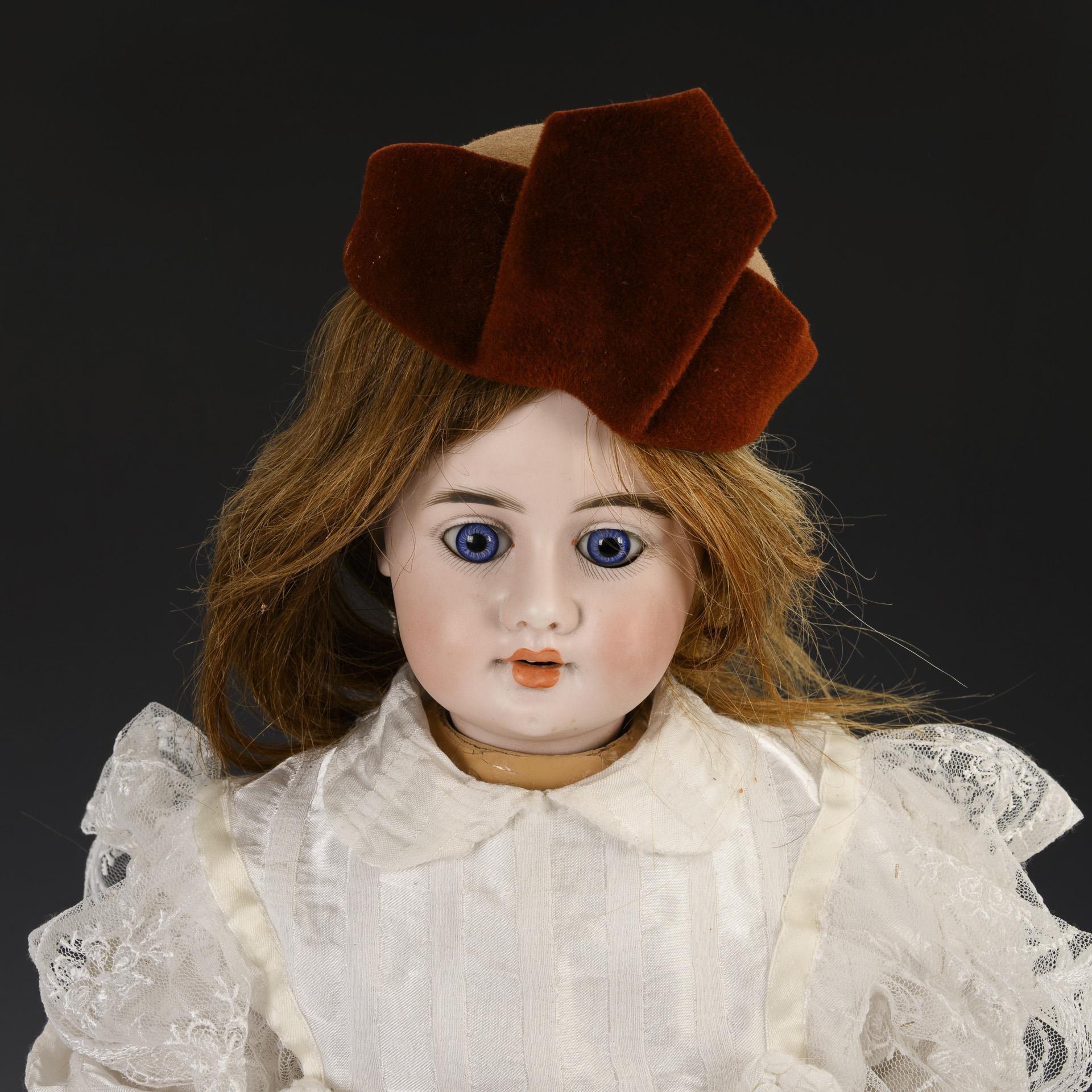 Cranked head, fixed blue glass eyes, reddish-brown real hair wig, 15-part jointed body. White dress, felt and velvet hat, leather shoes. Hairline crack on the right side of the chin, body with painted over repairs.