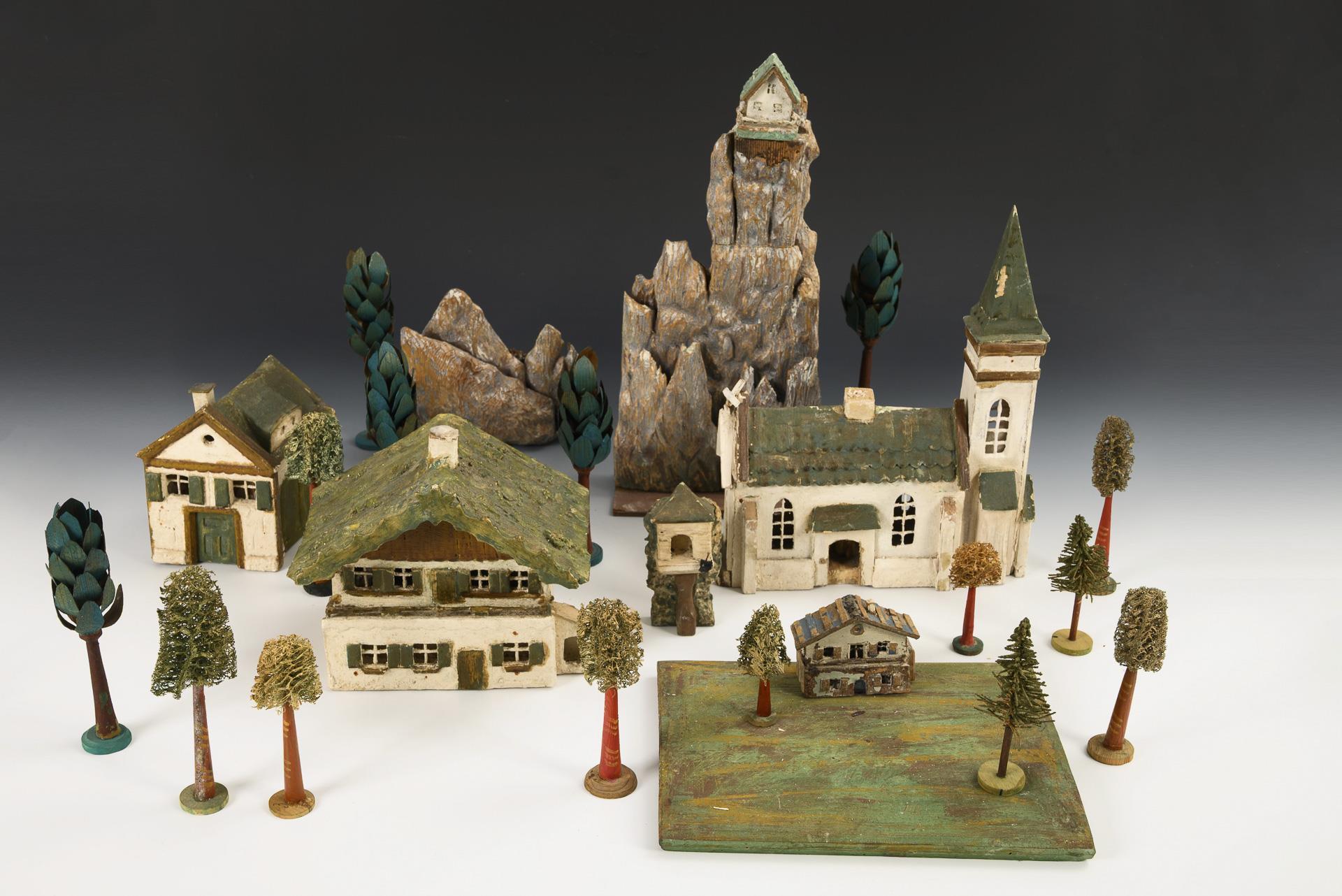 Various small houses, 2 mountains as background, plus some loofah and chip trees. Defects, partly repainted.