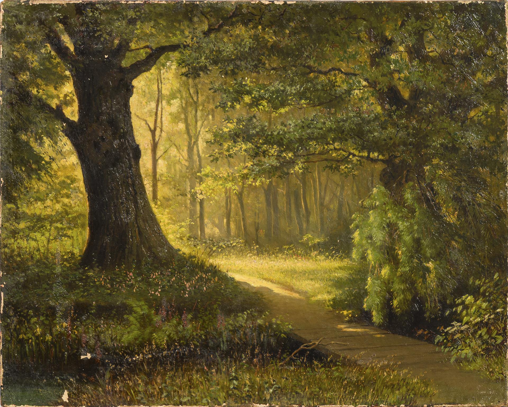 Incidental sunshine through the dense canopy onto a path between flowering meadows and old trees. Colour chips.