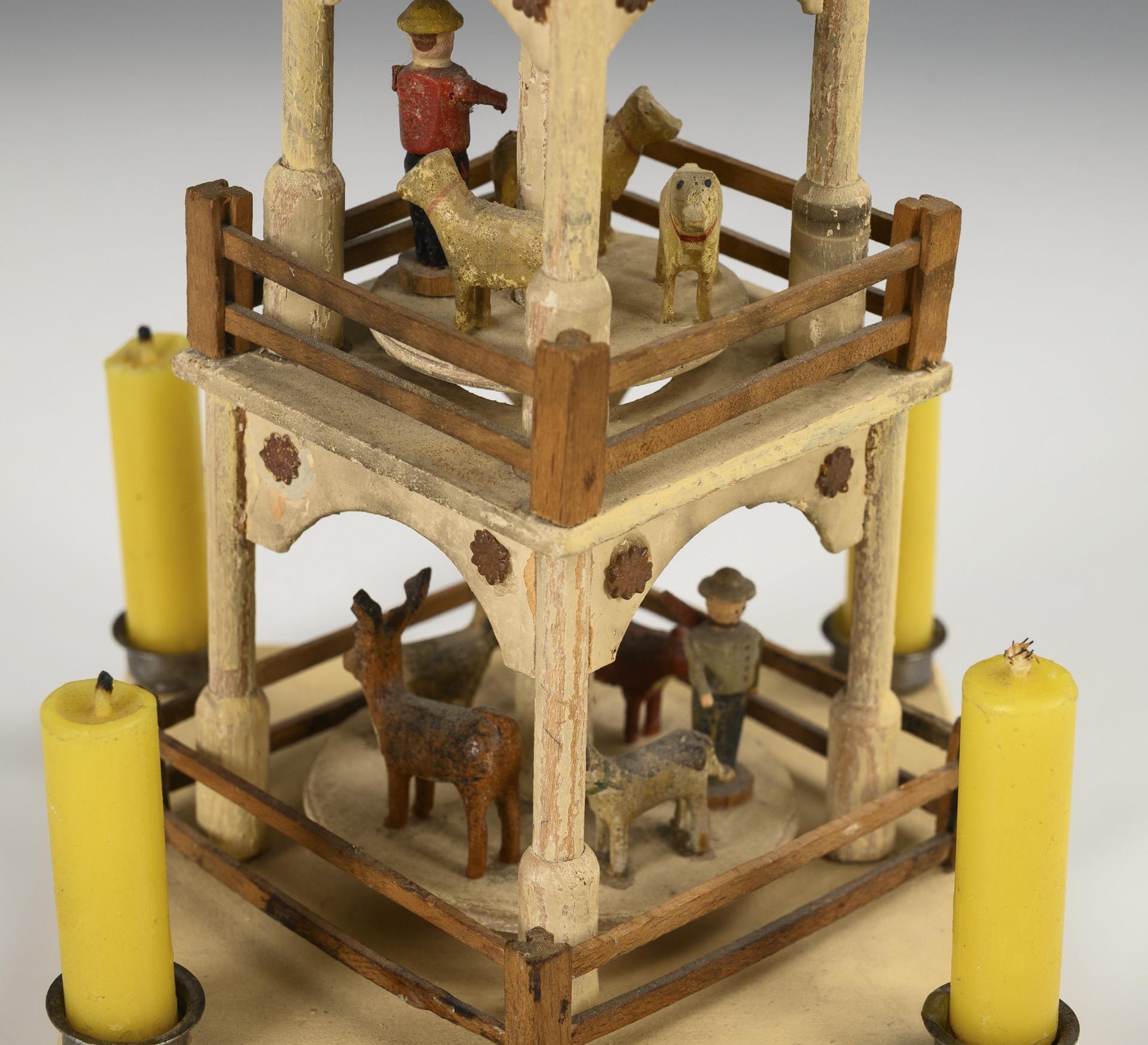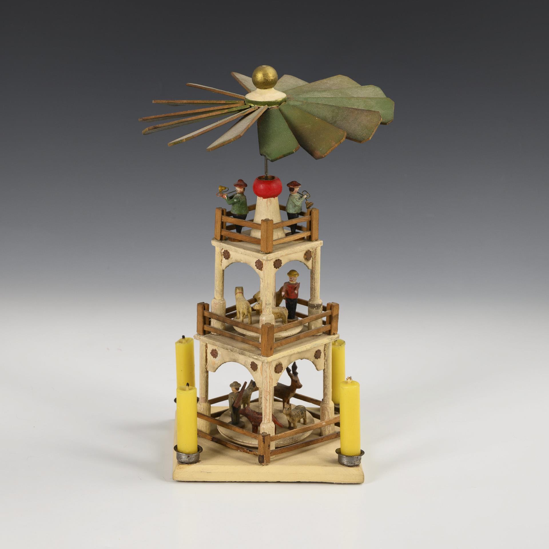 3-tiered, white pyramid with hunter and animals on 2 rotating levels. Signs of age, repairs.