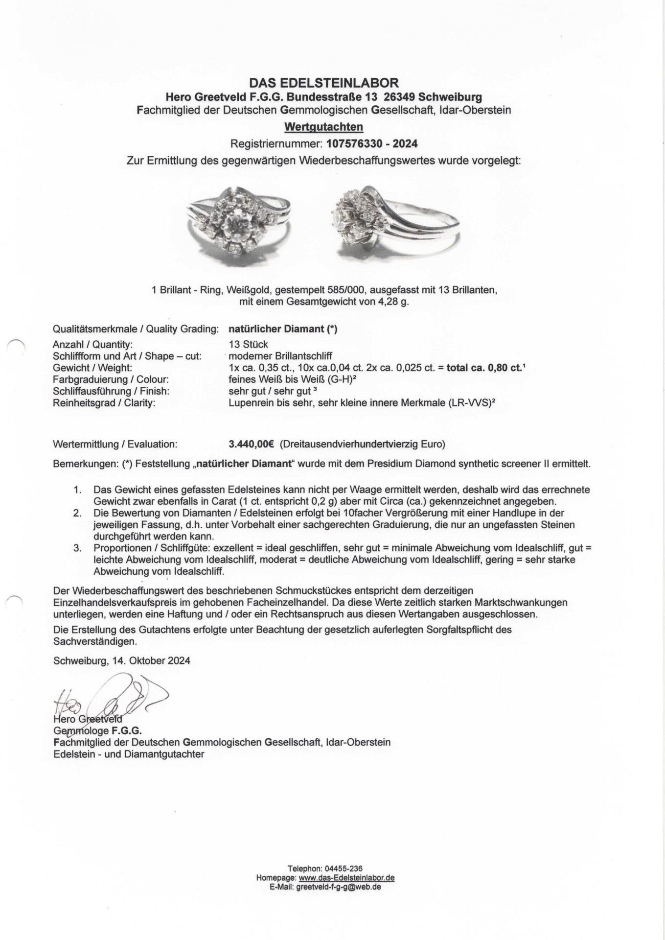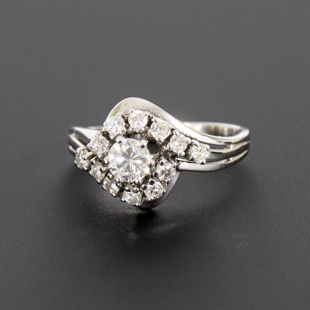 Hallmarked white gold 585. Ring size 55, the ring head max. approx. 11.86 x 14.36 mm, the diamonds together approx. 0.80 ct/G-H/LR-VVS. 4,28 g.
