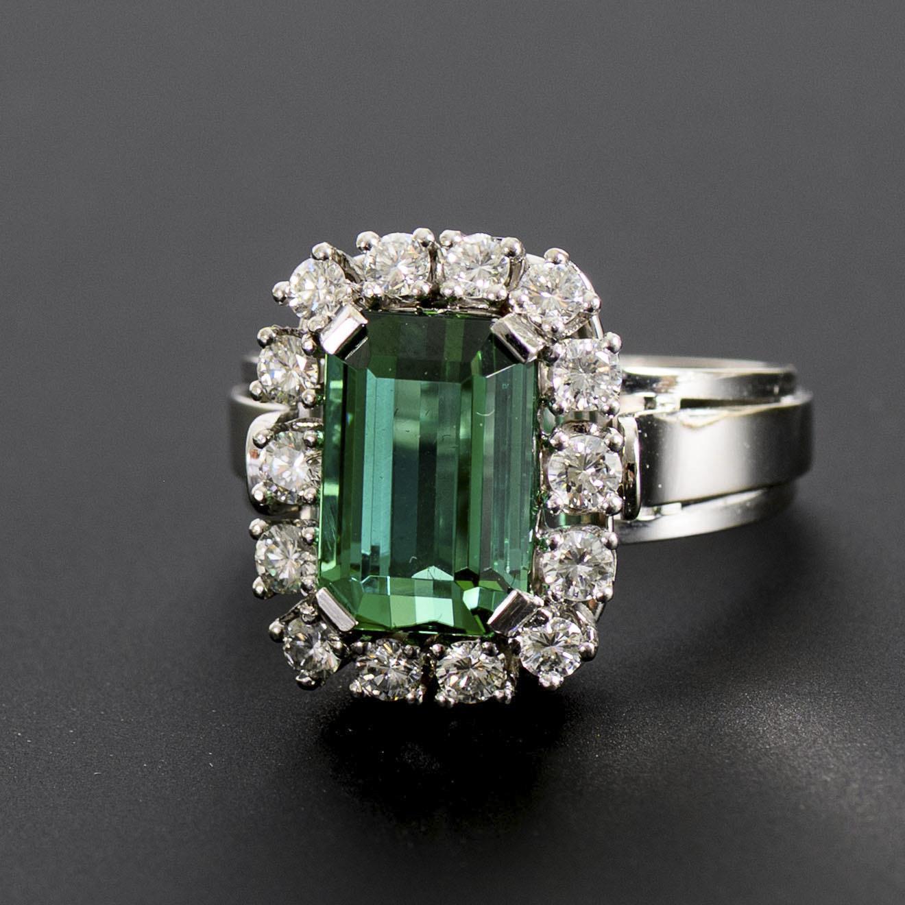 Entourage ring with tourmaline of the verdelite variety in emerald cut, surrounded by 14 brilliant-cut diamonds, on a wide rail.