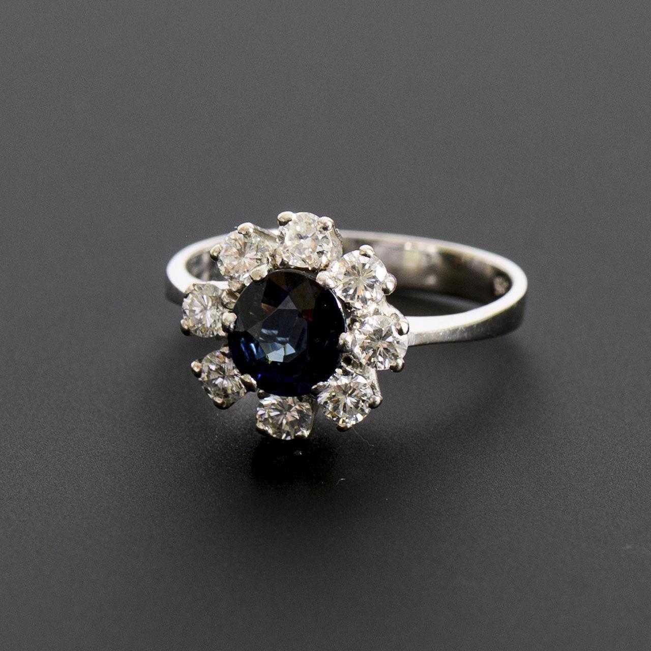 Daisy ring with central, round-faceted sapphire, probably heat-treated, surrounded by 8 brilliant-cut diamonds between a downward widening rail. With slight signs of wear on the underside.