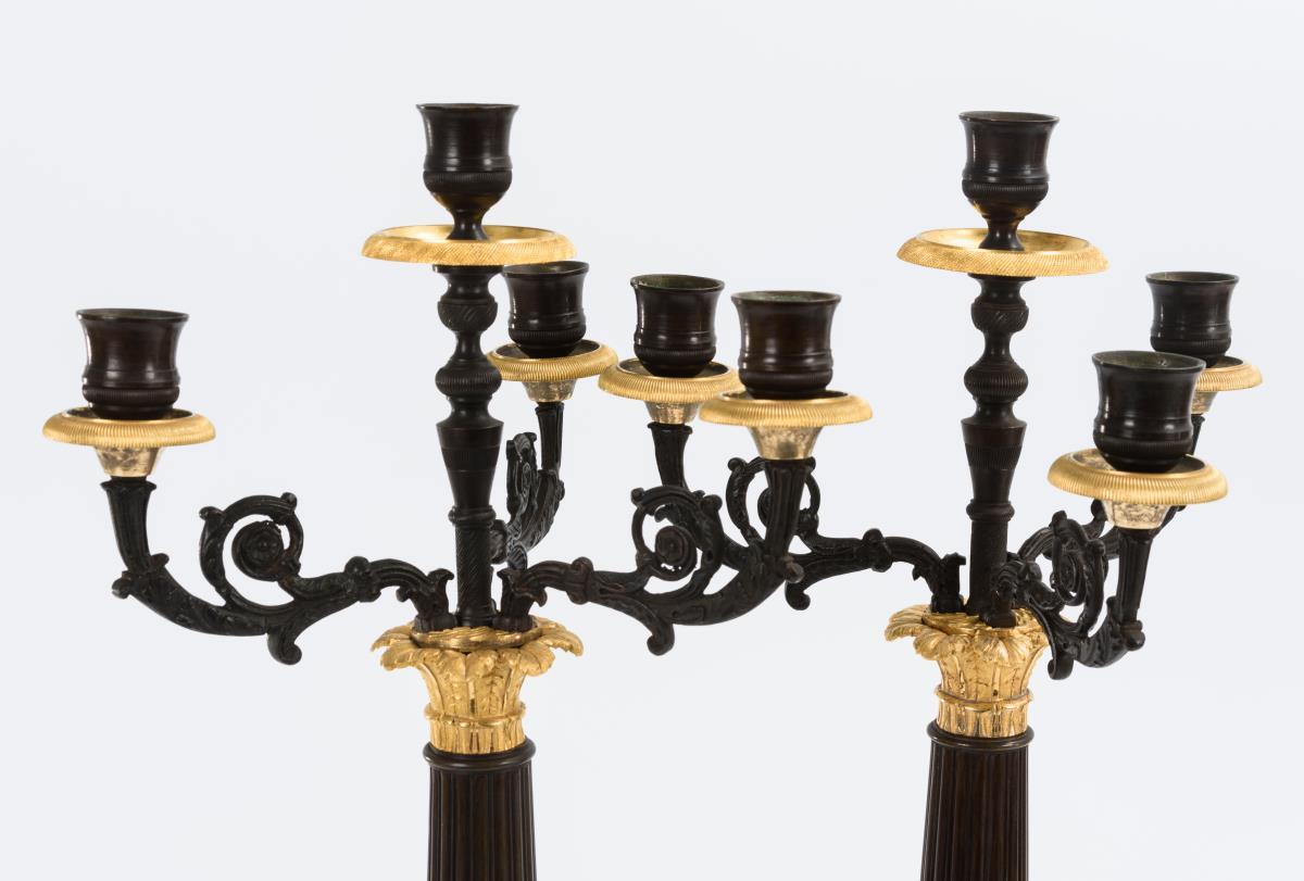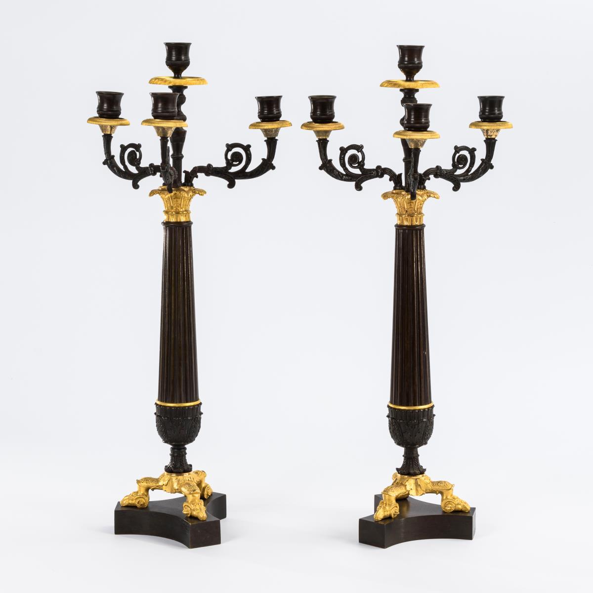Paar große, 4-flammige Prunk-Kandelaber im Empire-Stil. Um 1830. Frankreich. Bronze mit tiefbrauner Patinierung, partiell matt- und glanzvergoldet. H 56 cm. Dreibein mit Widderköpfen, Säulenschaft, 3 Volutenarme, erhöhte Zentraltülle. 3 Arme gelötet, 1 Arm leicht angebrochen..