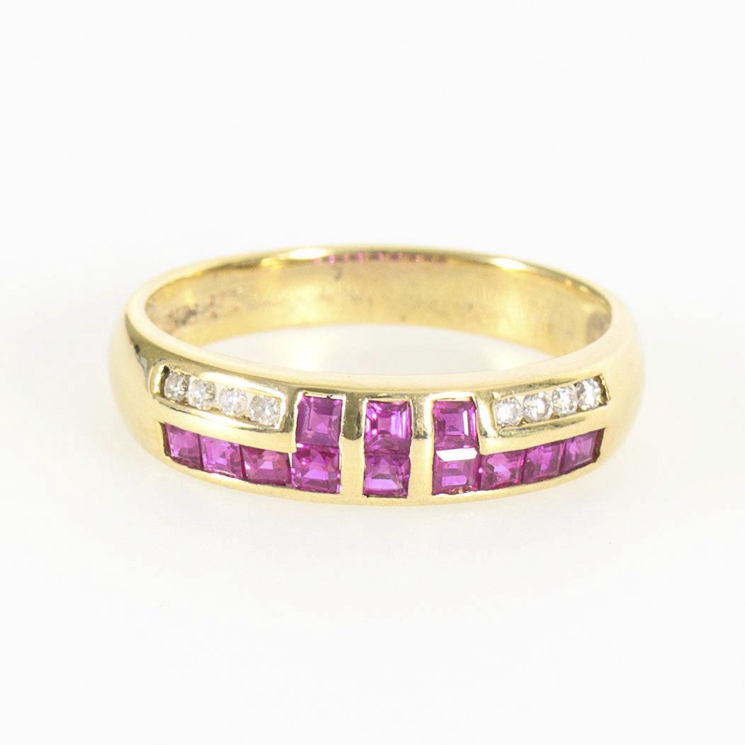 Band ring with red colored stone carrés, probably rubies, and small diamonds, each in channel setting.