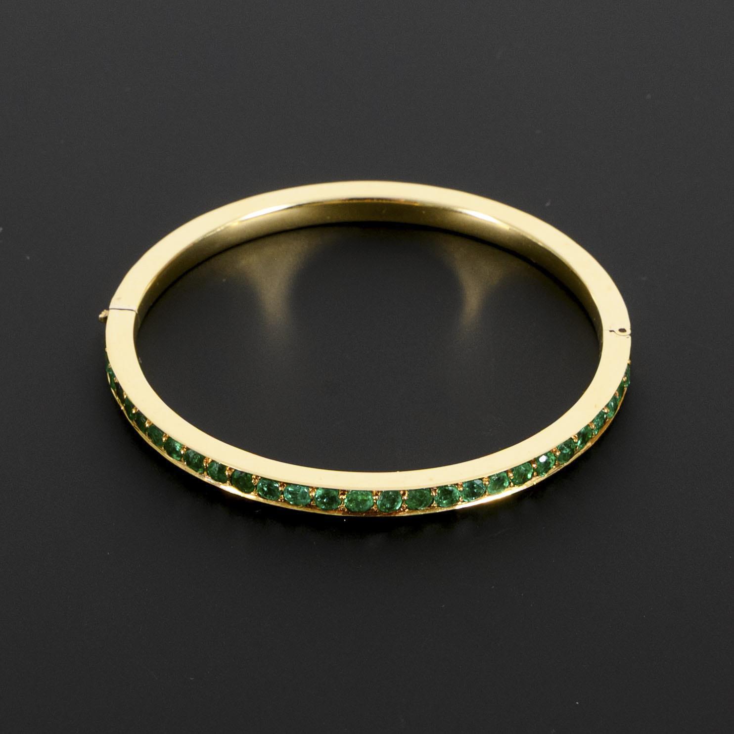 Bracelet, set all around with 58 round-faceted emeralds. Slight signs of wear.