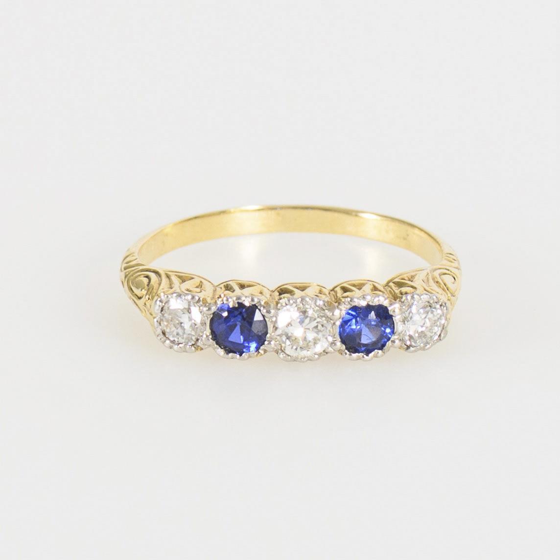 Historic ring, probably mid 2nd half of the 19th century, with 3 old-cut diamonds and 2 blue colored stones, probably sapphires, alternately set in white gold in the richly ornamental ring head. The blue colored stones with slight traces of wear on the cut edges, only visible under tenfold magnification.