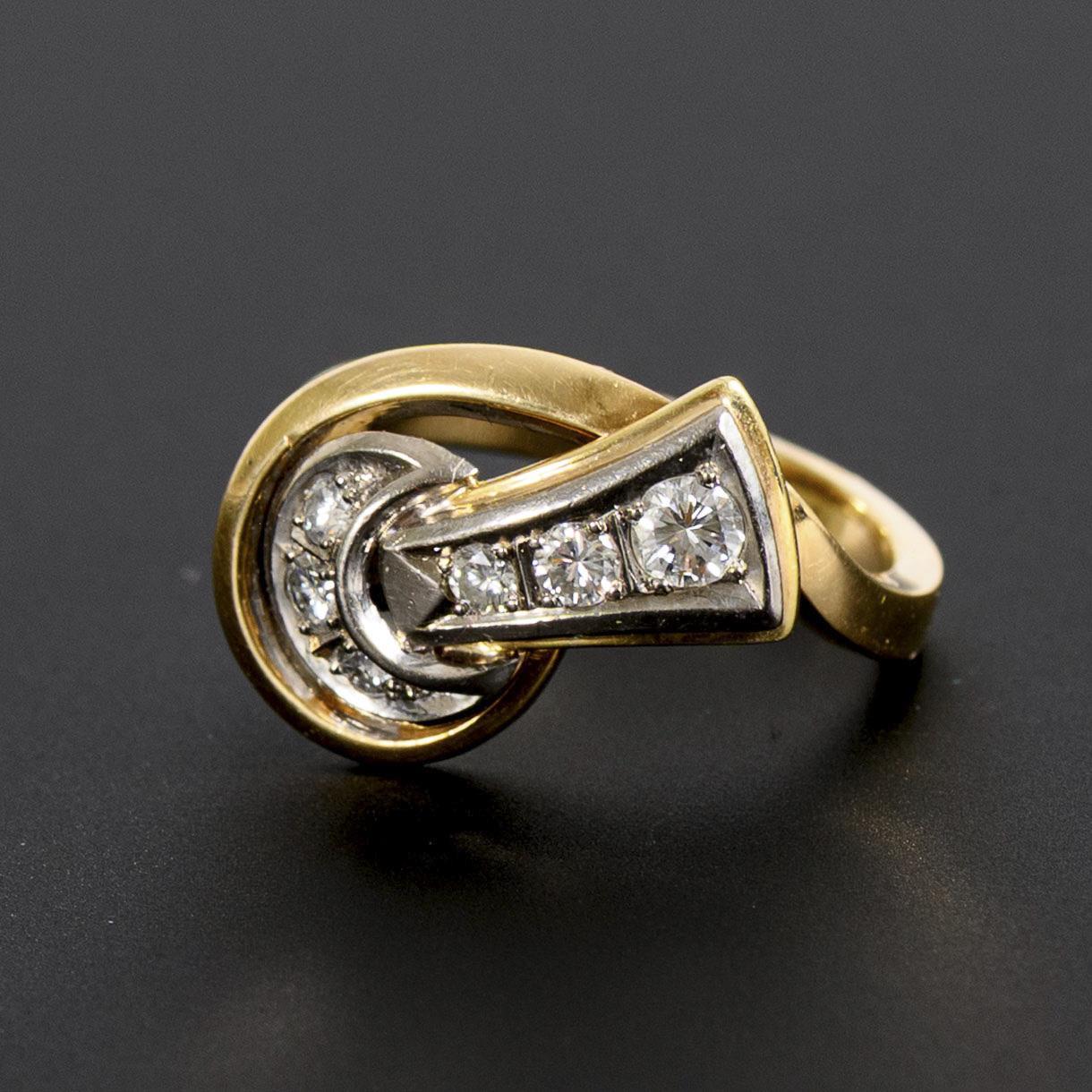 Bicolored ring with dynamically designed ring head with a white gold element reminiscent of a knot, this set with 6 brilliant-cut diamonds of different sizes. Slight signs of wear.