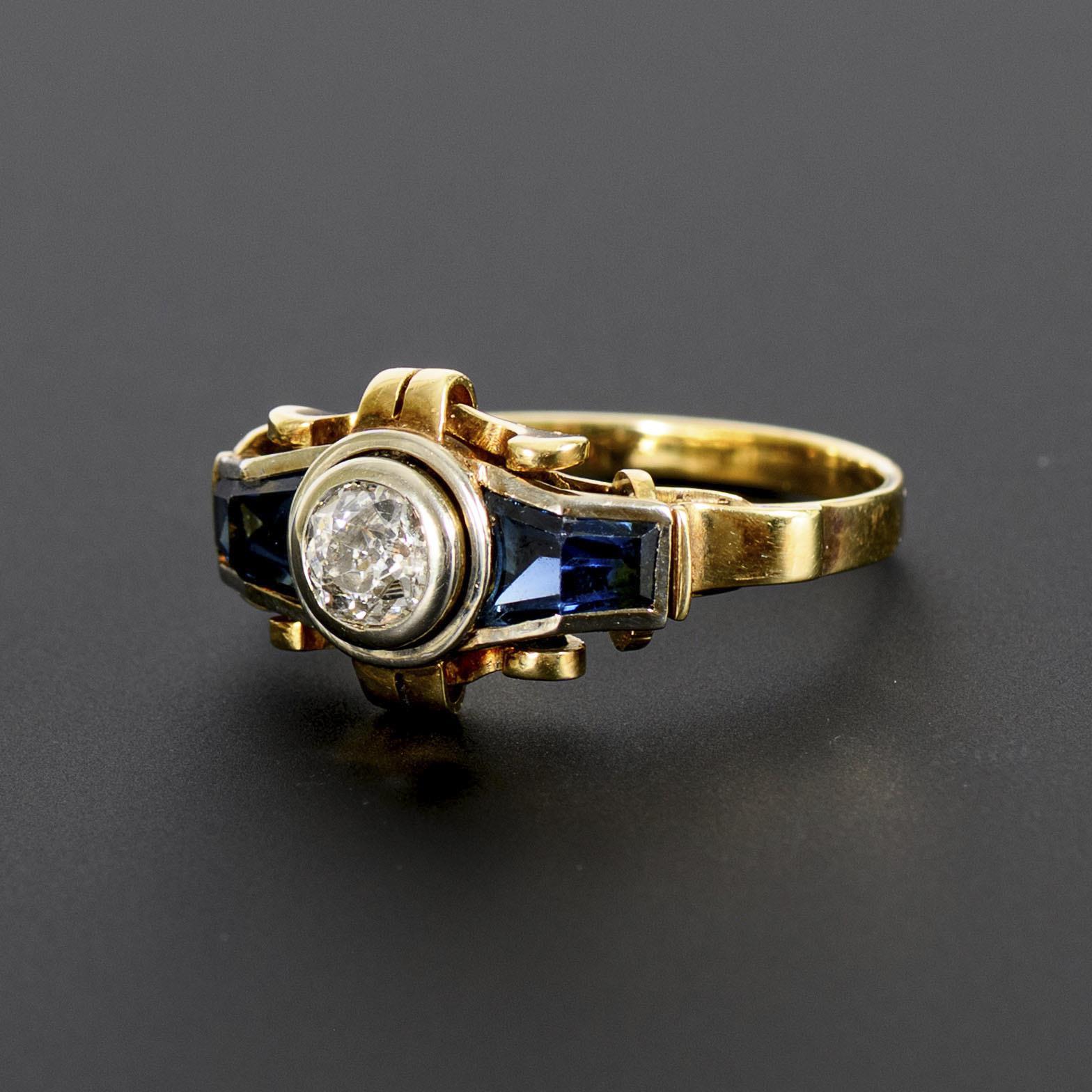 Bicolored ring with a large, central old-cut diamond, flanked by two blue coloured stone elements, probably sapphires, in a freely selected cut, in a yellow gold band. With slight traces of oxidation.
