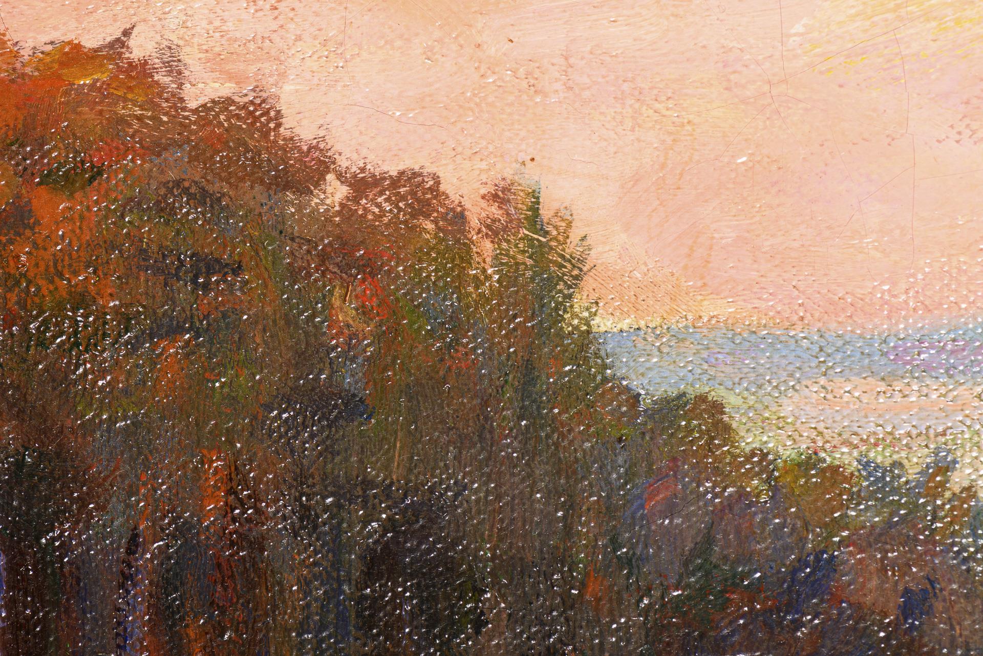 Hilly landscape with blossoming meadows and autumnal trees at dawn. Traces of age.