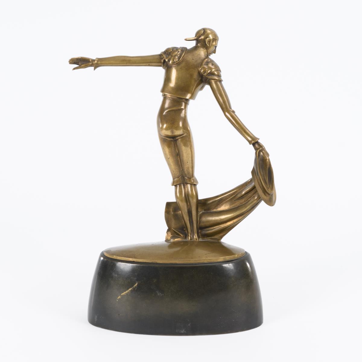 ALLMANN, Albert (1880 München - 1979 ebd.) Torero Bronze goldbraun patiniert, Bronzesockel dunkel patiniert. Bezeichnet. H 26 / 34,5 cm. Elegant das Tuch schwingender Stierkämpfer. Wenige Alters-/Gebrauchsspuren. Bildhauer in München, studierte an der Akademie ebd. bei Balthasar Schmitt. Literatur: Vollmer..