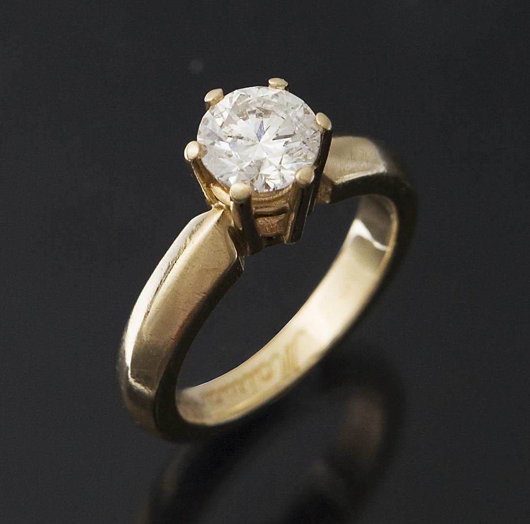 Brilliant in prong setting 1.01 ct, clarity P 1, color white H, cut very good, proportions very good, slight fluorescence. Stable full rail, hallmarks: Gold fineness, brilliant-carat, Idar-Oberstein no. G1 013692, marked with the name Maiwand, jeweler's mark.