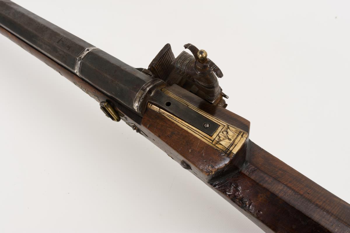 Achtkantiger Lauf, reich mit Messingeinlagen verziert. Gravierte Verbeinung, Ladestock aus Eisen. Einige Fehlteile der Verzierungen, Haltebänder für den Lauf ergänzt, kein Korn, Mechanik funktioniert nicht, Alters-/Gebrauchsspuren..