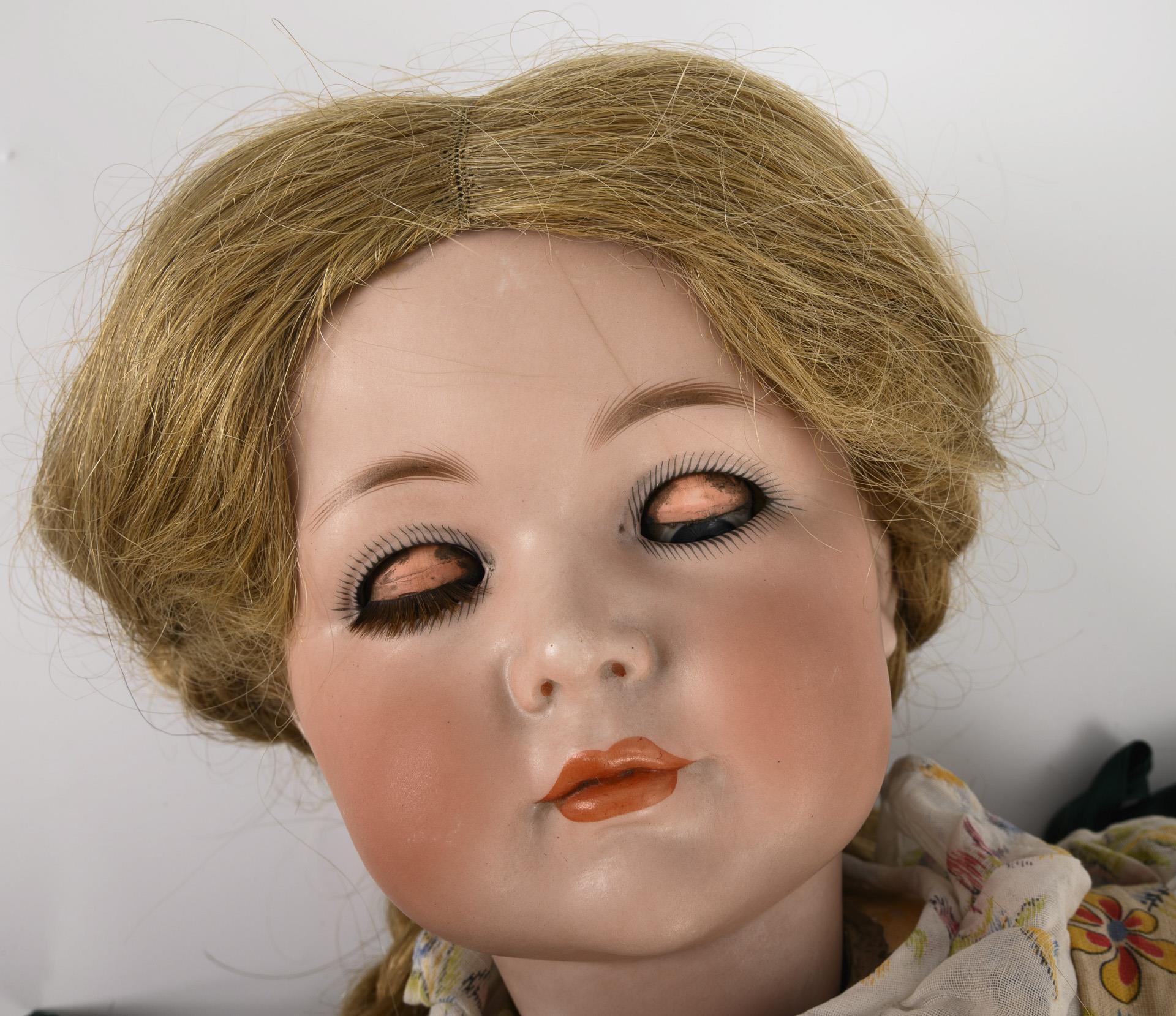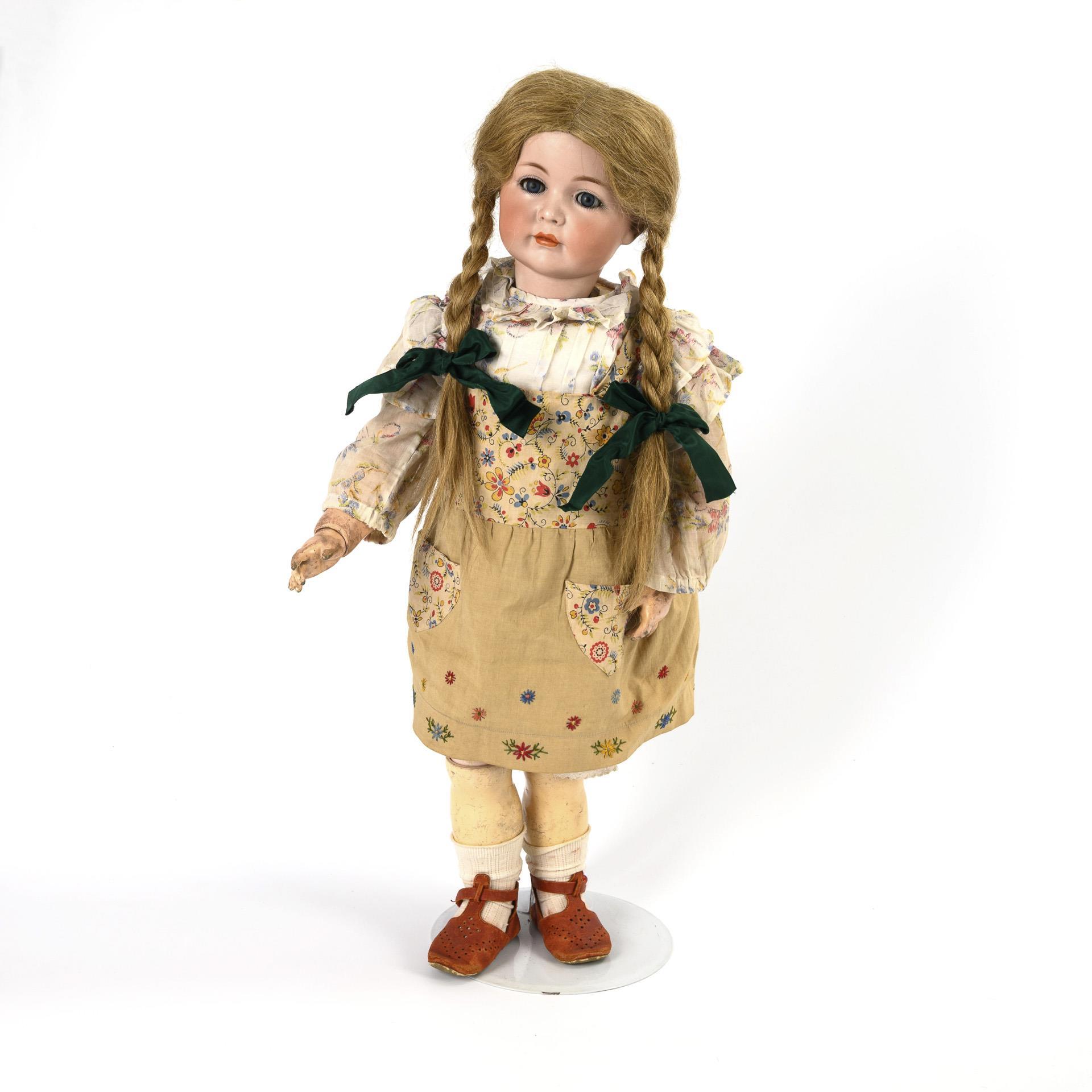Cranked head, blue sleeping eyes, closed mouth, blonde real hair wig with plaits. 17-piece jointed body. Flowered apron dress with embroidery, red leather shoes. Hairline crack on the forehead, body with color defects, right foot with repair.