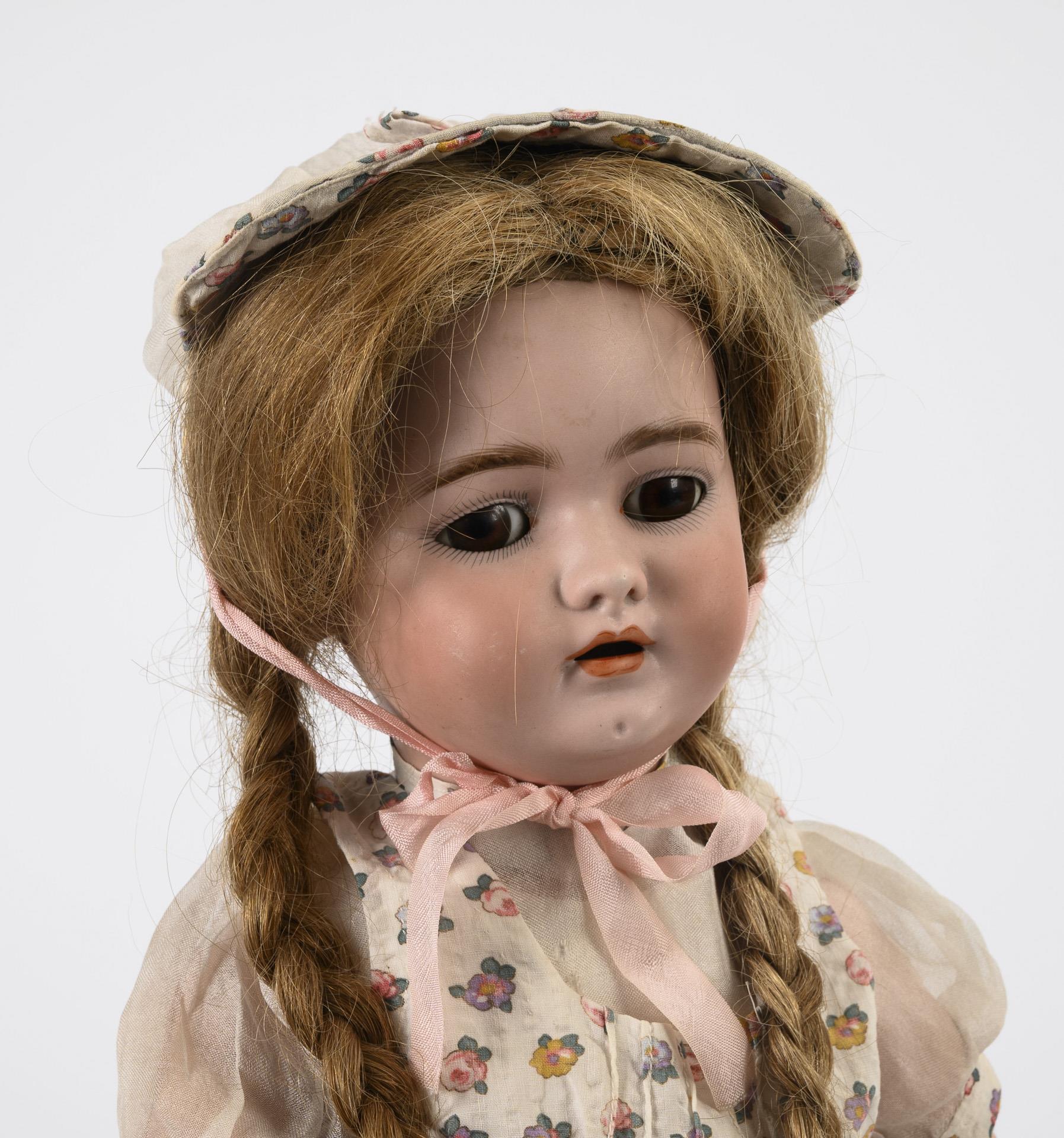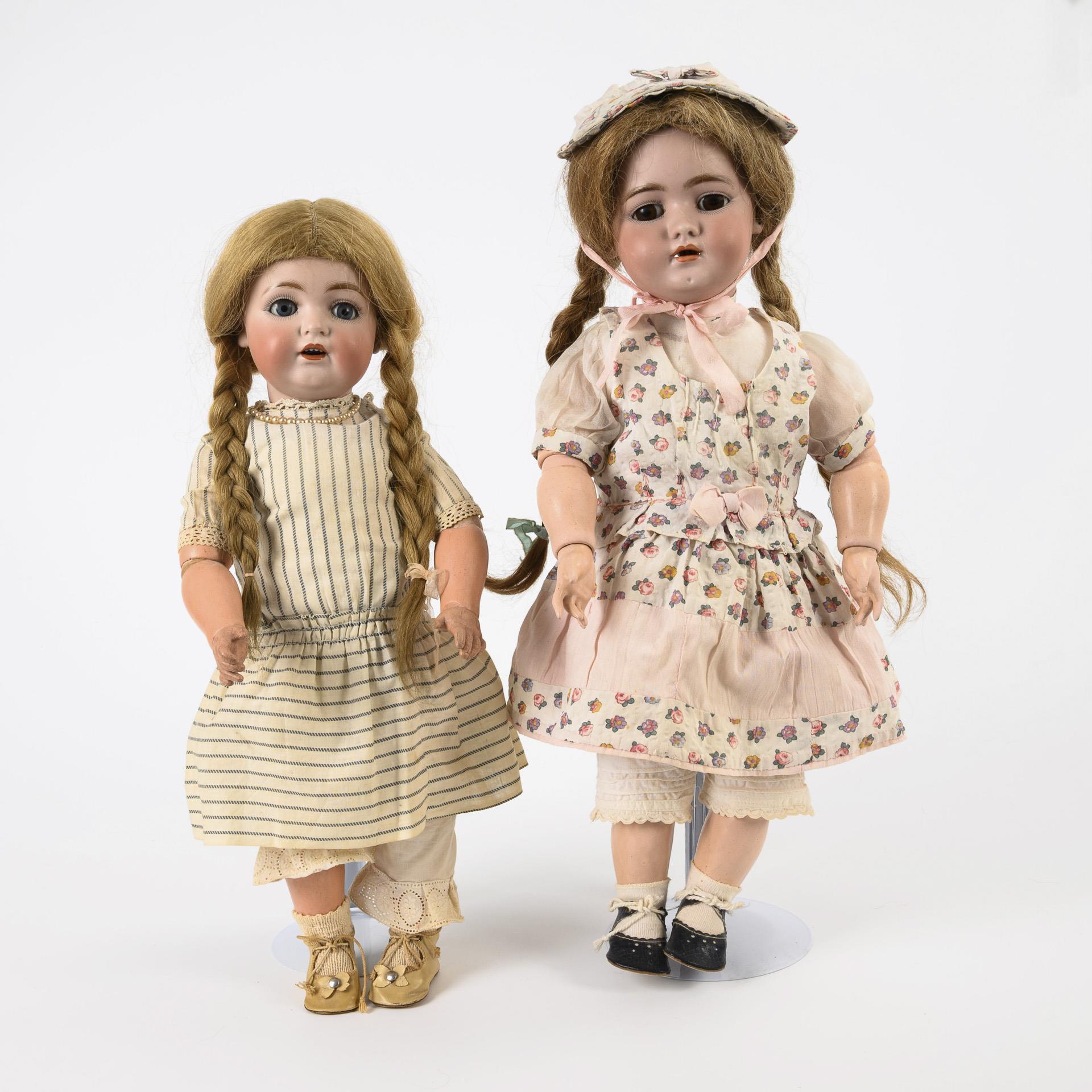 Both with crank head, sleeping eyes, real hair wig, jointed body, patterned dress and oilcloth shoes. Kestner girl (JDK 260) with painted rubber hands, striped dress and light-colored shoes, l 52 cm. / Franz Schmidt doll (S & C) with pink flowered dress and black shoes. 1 ear hole with chip, l 54 cm. Heads x-rayed: without defects.