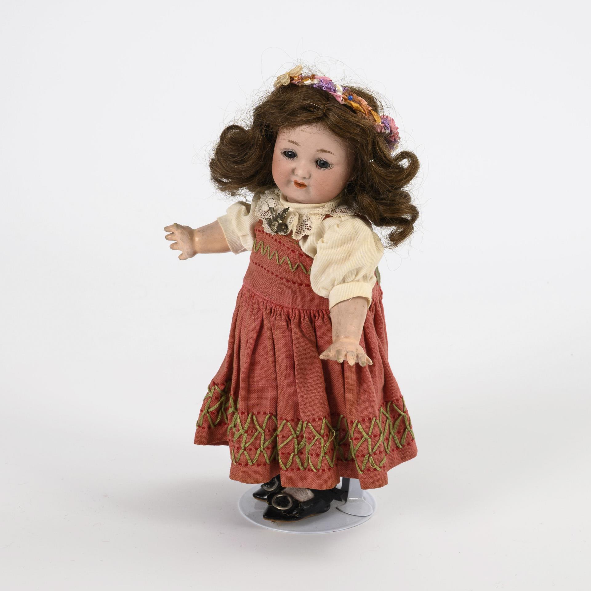 Cranked head, blue sleeping eyes, open mouth, curly brown real hair wig. 5-part standing doll body with hands spread out in googly style. Red dress, hair wreath, old black shoes. Head x-rayed: without defects.