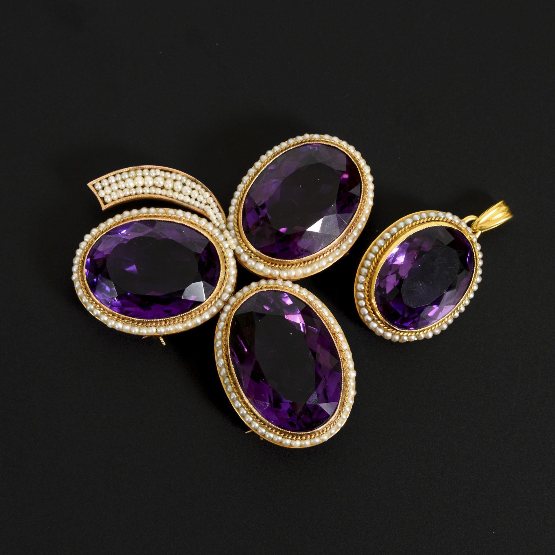 Historical set of brooch and pendant with amethysts and seed pearls.