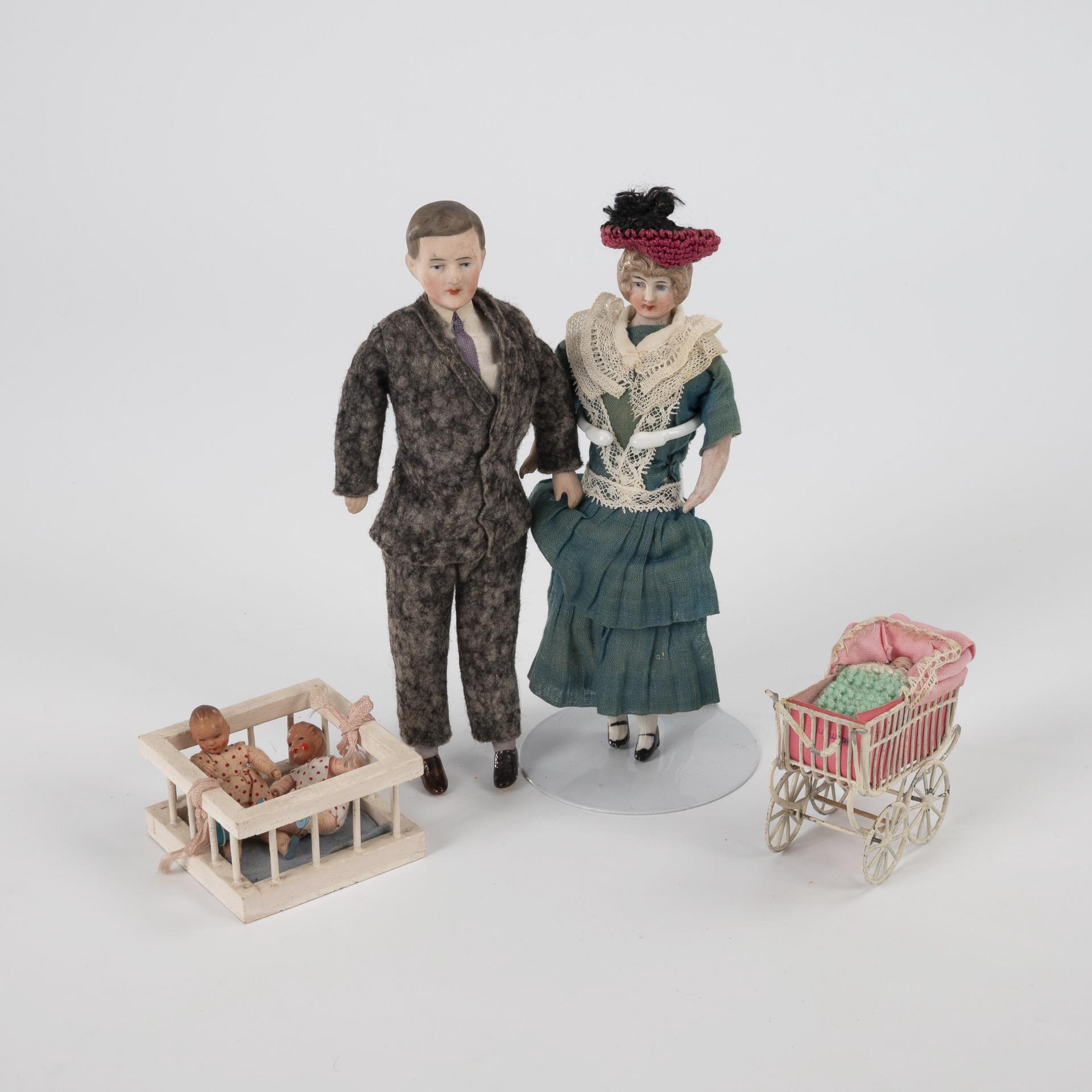 2 doll's house dolls with chest head, fabric body and bisque limbs, as man and woman (H 18.5/16 cm). / Rare, white lacquered doll's pram with celluloid baby / White wooden playpen with 2 bending dolls. Slight signs of age, pram with breakage.